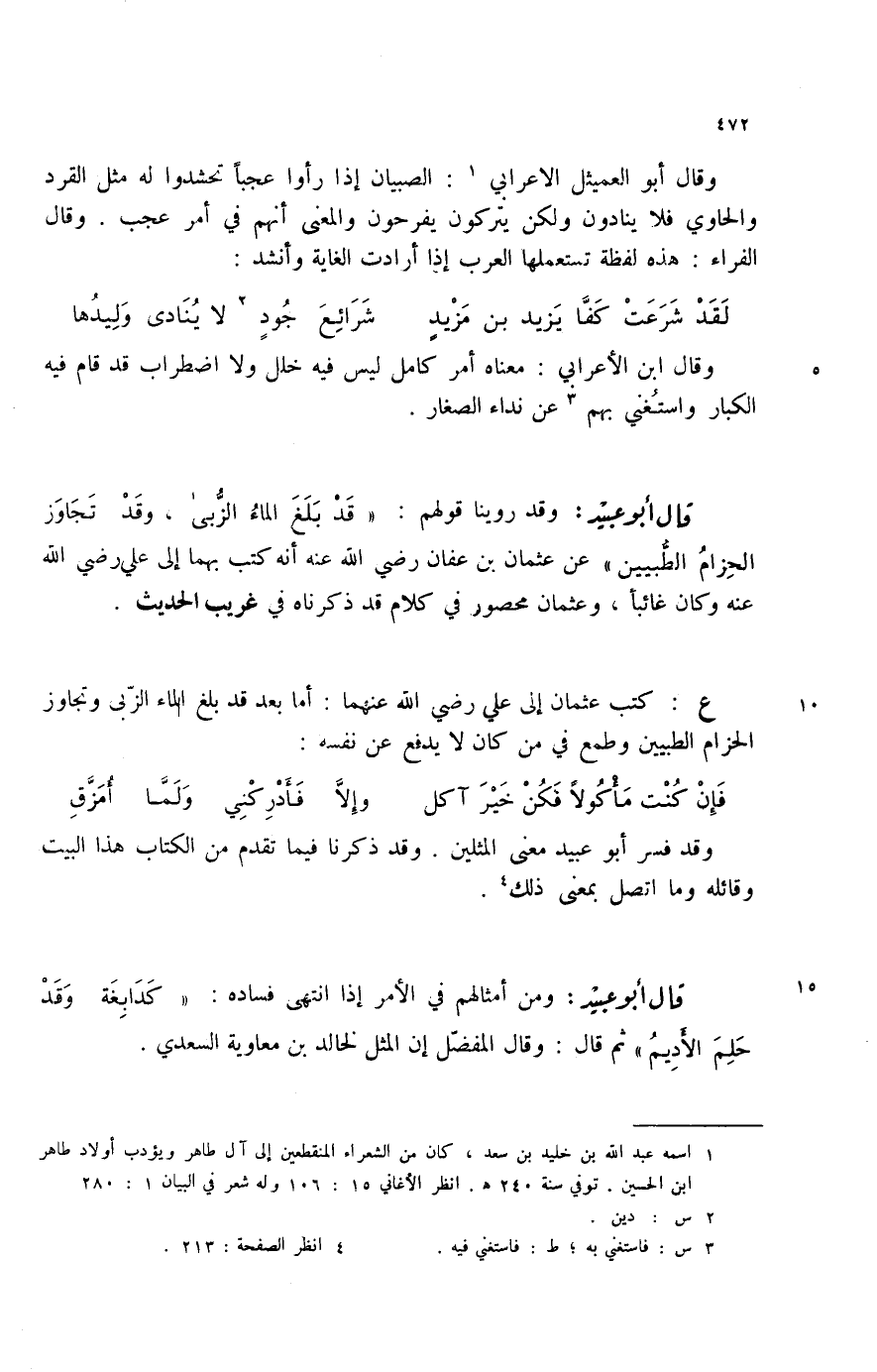 قا أبو عبيد: وقد روينا قولهم: " قد بلغ الماء الزبى، وقد تجاوز الحزام الطبيين " عن عثمان بن عفان رضي الله عنه كتب بهما إلى علي رضي الله عنه وكان غائباً، وعثمان محصور في كلام قد ذكرناه في غريب الحديث.