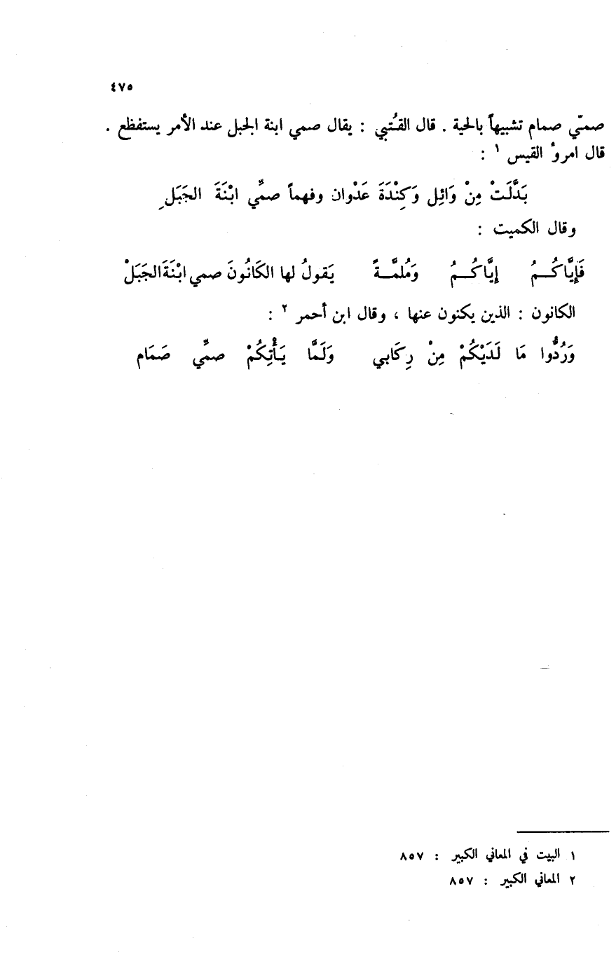 صمي صمام تشبيهاً بالحية. قال القتبي: يقال صمي ابنة الجبل عند الأمر يستفظع. قال امرؤ القيس (1) :