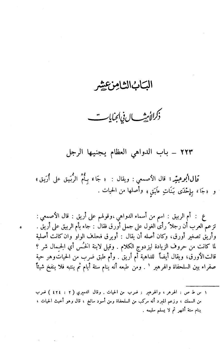 ع: أم الربيق: اسم من أسماء الدواهي، وقولهم على أريق: قال الأصمعي: تزعم العرب أن رجلاً رأى الغول على جمل أورق فقال: جاء بأم الربيق على أريق. وأريق تصغير أورق، وكان أصله أن يقال: أويرق فحذف الواو وإن كانت أصلية لما كانت من حروف الزيادة ليزدوج الكلام. وقيل لابنة الخس أي الجمال شر؟ قالت الأورق؛ ويقال أيضاً للداهية أم أريق. وأم طبق ضرب من الحيات وهو حية صفراء بين السلحفاة والهرهير (1) . ومن طبعه أن ينام ستة أيام ثم ينتبه فلا ينفخ شيئاً