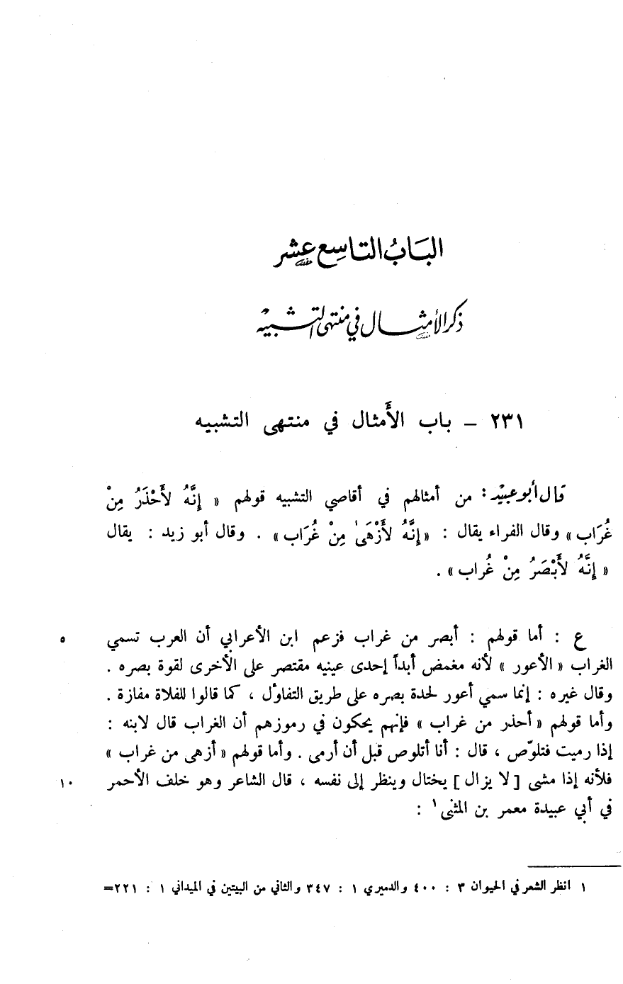 قال أبو عبيد: من أمثالهم في أقاصي التشبيه قولهم " إنه لأحذر من غراب " وقال الفراء يقال: " إنه لأزهى من غراب ". وقال أبو زيد: يقال " إنه لأبصر من غراب ".