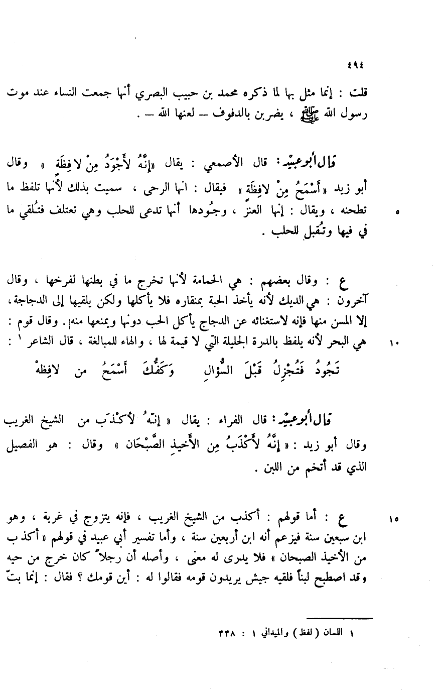 تجود فتجزل قبل السؤال ... وكفك أسمح من لافظه قال أبو عبيد: قال الفراء: يقال " إنه لأكذب من الشيخ الغريب وقال أبو زيد: " إنه لأكذب من الأخيذ الصبحان " وقال: هو الفصيل الذي قد أتخم من اللبن.