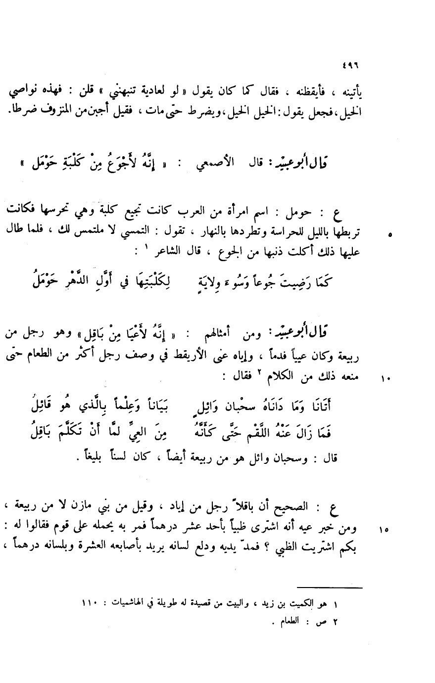 كما رضيت جوعاً وسوء ولايةٍ ... لكلبتها في أول الدهر حومل قال أبو عبيد: ومن أمثالهم: " إنه لأعيا من باقل " وهو رجل من ربيعة وكان عيباً فدماً، وإياه عنى الأريقط في وصف رجل أكثر من الطعام حتى منعه ذلك من الكلام (2) فقال: