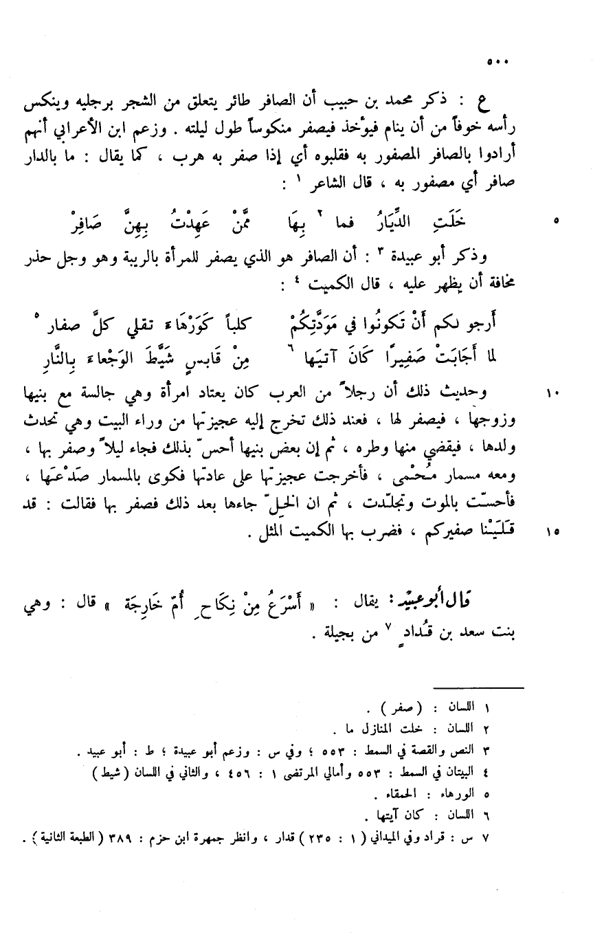 خلت الديار (2) فما بها ... ممن عهدت بهن صافر وذكر أبو عبيدة (3) : أن الصافر هو الذي يصفر للمرأة بالريبة وهو وجل حذر مخافة أن يظهر عليه، قال الكميت (4) :