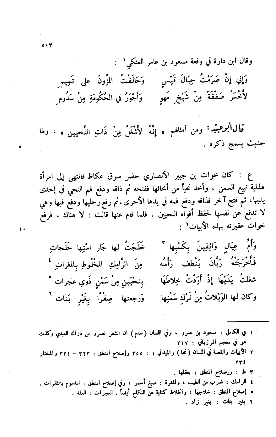 لأخسر صفقة من شيخ مهوٍ ... وأجور في الحكومة من سدوم قال أبو عبيد: ومن أمثالهم " إنه لأشغل من ذات النحيين "، ولها حديث يسمج ذكره.