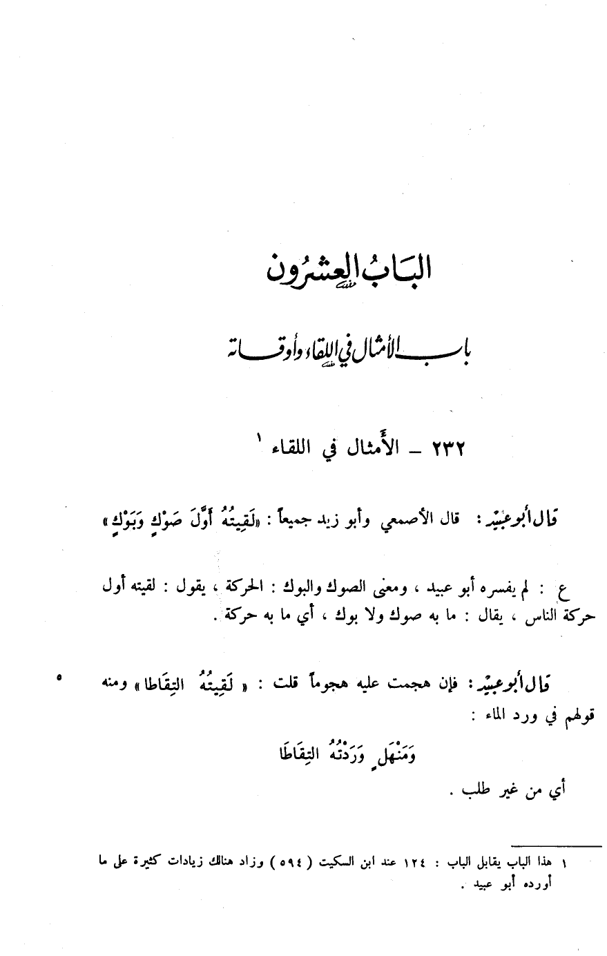 (1) هذا الباب يقابل الباب: 124 عند ابن السكيت (594) وزاد هنالك زيادات كثيرة على ما أورده أبو عبيد.