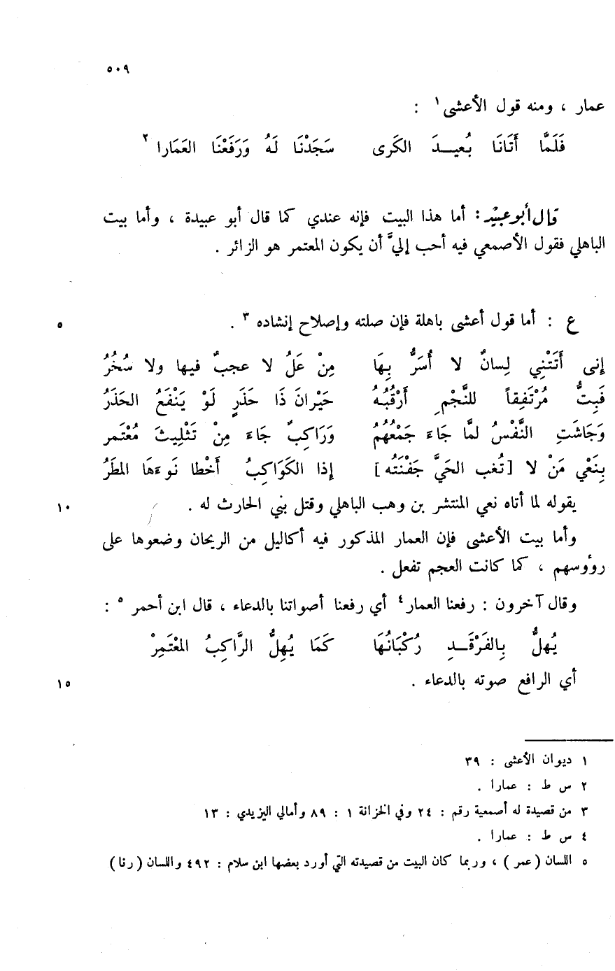 فلما أتانا بعيد الكرى ... سجدنا له ورفعنا العمارا (2) قال أبو عبيد: أما هذا البيت فإنه عندي كما قال أبو عبيدة، وأما بيت الباهلي فقول الأصمعي فيه حب إليّ أن يكون المعتمر هو الزائر.