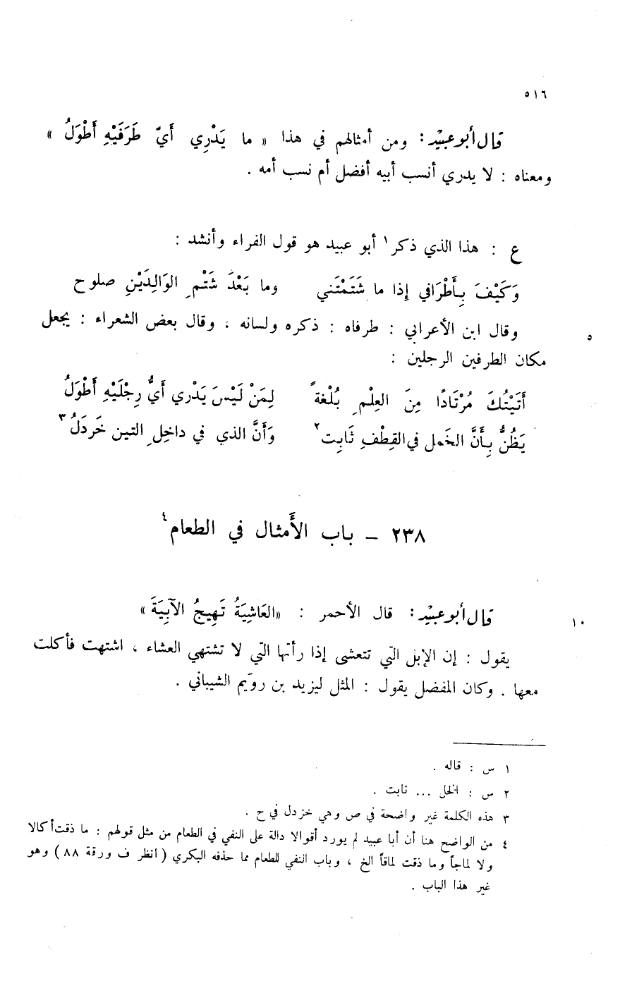 (4) من الواضح هنا أن أبا عبيد لم يورد أقوالاً دالة على النفي في الطعام من مثل قولهم: ما ذقت أكالا ولا لماجاً وما ذقت لماقاً الخ، وباب النفي للطعام مما حذفه البكري (انظر ف ورقة 88) وهو غير هذا الباب.