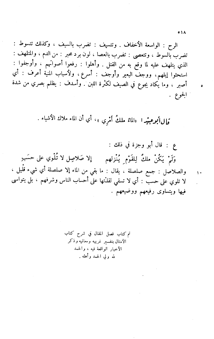 ولم يكن ملك للقوم ينزلهم ... إلا صلاصل لا تلوي على حسب والصلاصل: جمع صلصلة، يقال: ما بقي من الماء إلا صلصلة أي شيء قليل، لا تلوي على حسب: أي لا تسقي لقلتها على أحساب الناس وشرفهم، بل يتواسى فيها ويتساوى رفيعهم ووضيعهم.