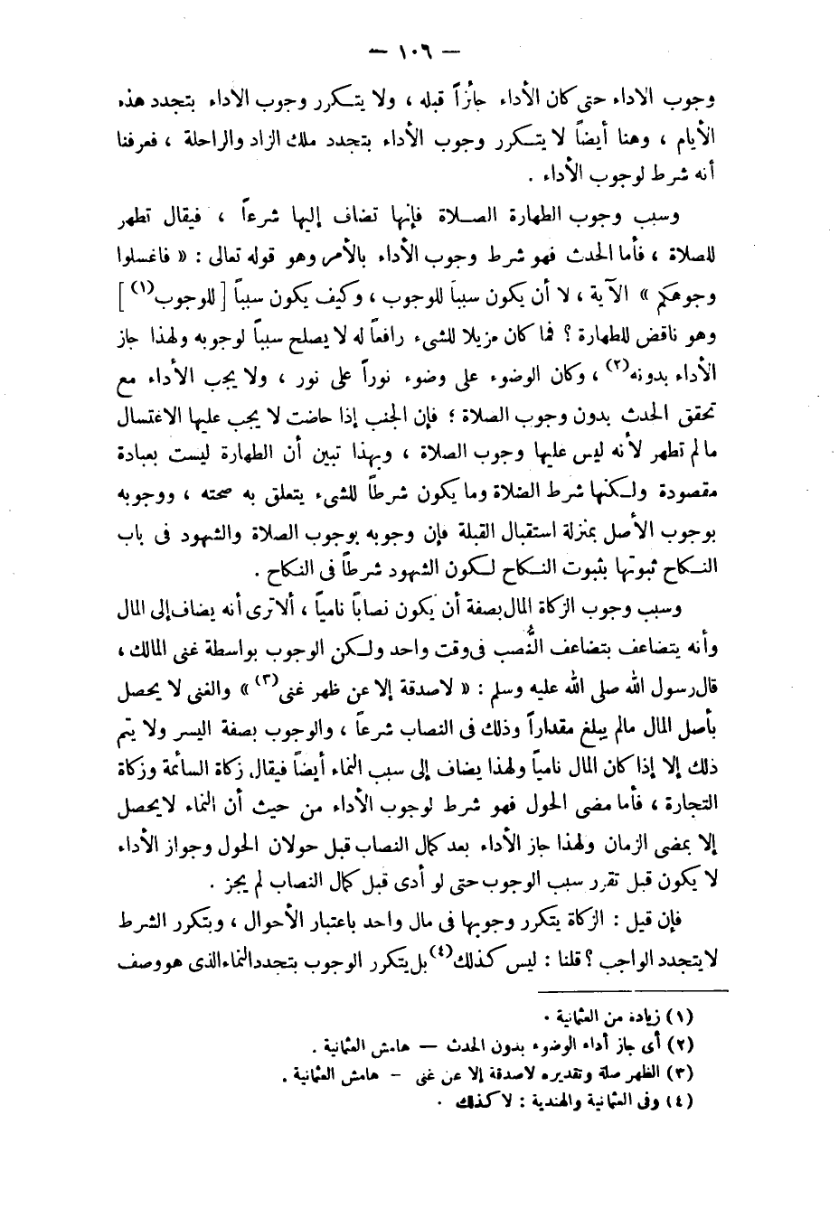 وجوب الْأَدَاء حَتَّى كَانَ الْأَدَاء جَائِزا قبله وَلَا يتَكَرَّر وجوب {وُجُوهكُم} الْآيَة لَا أَن يكون سَببا للْوُجُوب وَكَيف يكون سَببا (للْوُجُوب) وَهُوَ نَاقض للطَّهَارَة فَمَا كَانَ مزيلا للشَّيْء رَافعا لَهُ لَا يصلح سَببا لوُجُوبه وَلِهَذَا جَازَ الْأَدَاء بِدُونِهِ وَكَانَ الْوضُوء على وضوء نورا على نور وَلَا يجب الْأَدَاء مَعَ تحقق الْحَدث بِدُونِ وجوب الصَّلَاة فَإِن الْجنب إِذا حَاضَت لَا يجب عَلَيْهَا الِاغْتِسَال مَا لم تطهر لِأَنَّهُ لَيْسَ عَلَيْهَا وجوب الصَّلَاة وَبِهَذَا تبين أَن الطَّهَارَة لَيست بِعبَادة مَقْصُودَة وَلكنهَا شَرط الصَّلَاة وَمَا يكون شرطا للشَّيْء يتَعَلَّق بِهِ صِحَّته ووجوبه بِوُجُوب الأَصْل بِمَنْزِلَة اسْتِقْبَال الْقبْلَة فَإِن وُجُوبه بِوُجُوب الصَّلَاة وَالشُّهُود فِي بَاب النِّكَاح ثُبُوتهَا بِثُبُوت النِّكَاح لكَون الشُّهُود شرطا فِي النِّكَاح