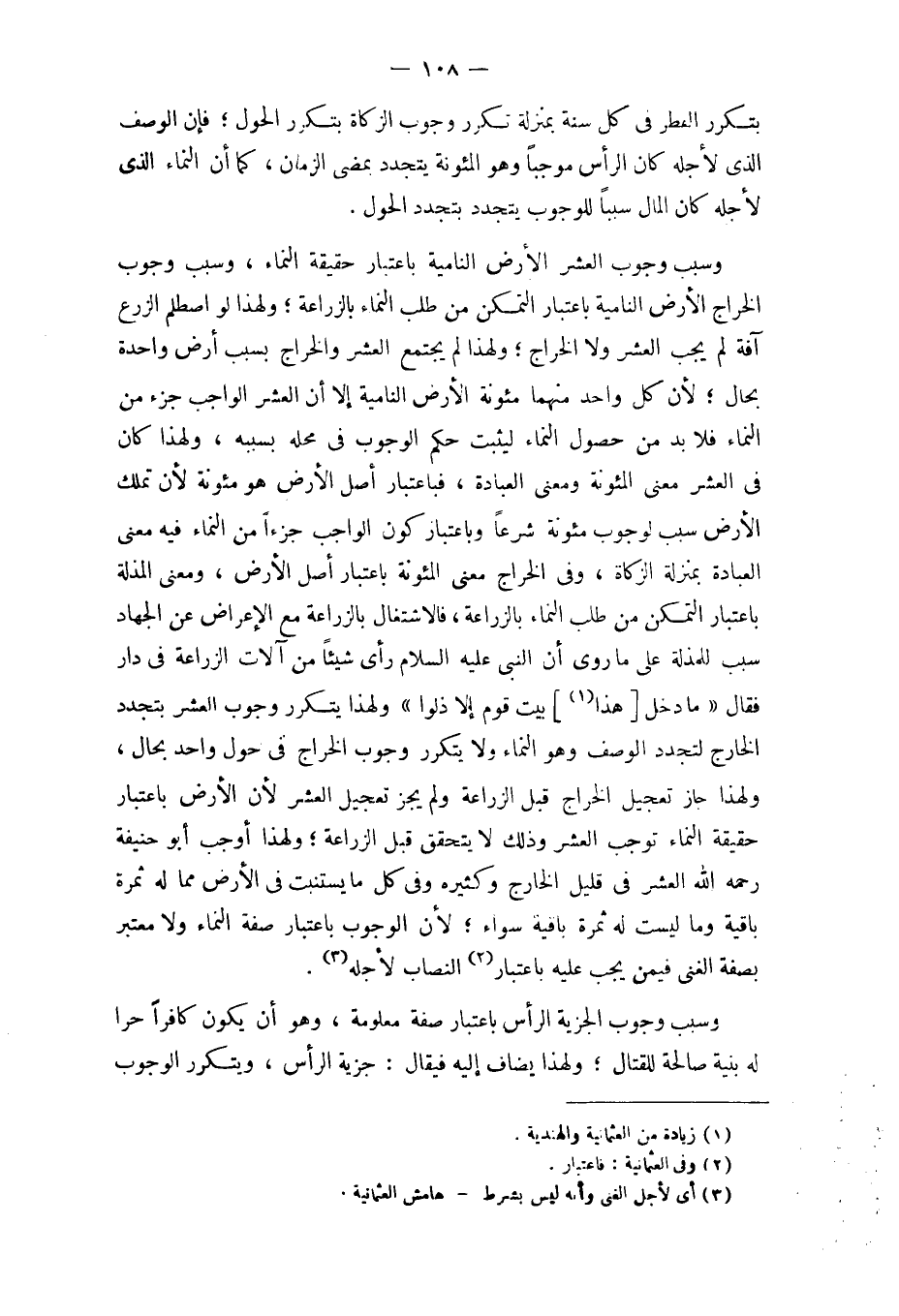 وَسبب وجوب الْعشْر الأَرْض النامية بِاعْتِبَار حَقِيقَة النَّمَاء وَسبب وجوب الْخراج الأَرْض النامية بِاعْتِبَار التَّمَكُّن من طلب النَّمَاء بالزراعة وَلِهَذَا لَو اصطلم الزَّرْع آفَة لم يجب الْعشْر وَلَا الْخراج وَلِهَذَا لم يجْتَمع الْعشْر وَالْخَرَاج بِسَبَب أَرض وَاحِدَة بِحَال لِأَن كل وَاحِد مِنْهُمَا مئونة الأَرْض النامية إِلَّا أَن الْعشْر الْوَاجِب جُزْء من النَّمَاء فَلَا بُد من حُصُول النَّمَاء ليثبت حكم الْوُجُوب فِي مَحَله بِسَبَبِهِ وَلِهَذَا كَانَ فِي الْعشْر معنى المئونة وَمعنى الْعِبَادَة فباعتبار أصل الأَرْض هُوَ مئونة لِأَن تملك الأَرْض سَبَب لوُجُوب مئونة شرعا وَبِاعْتِبَار كَون الْوَاجِب جُزْءا من النَّمَاء فِيهِ معنى الْعِبَادَة بِمَنْزِلَة الزَّكَاة وَفِي الْخراج معنى المئونة بِاعْتِبَار أصل الأَرْض وَمعنى المذلة بِاعْتِبَار التَّمَكُّن من طلب النَّمَاء بالزراعة فالاشتغال بالزراعة مَعَ الْإِعْرَاض عَن الْجِهَاد سَبَب للمذلة على مَا رُوِيَ أَن النَّبِي عَلَيْهِ السَّلَام رأى شَيْئا من آلَات الزِّرَاعَة فِي دَار فَقَالَ مَا دخل (هَذَا) بَيت قوم إِلَّا ذلوا وَلِهَذَا يتَكَرَّر وجوب الْعشْر بتجدد الْخَارِج لتجدد الْوَصْف وَهُوَ النَّمَاء وَلَا يتَكَرَّر وجوب الْخراج فِي حول وَاحِد بِحَال وَلِهَذَا جَازَ تَعْجِيل الْخراج قبل الزِّرَاعَة وَلم يجز تَعْجِيل الْعشْر لِأَن الأَرْض بِاعْتِبَار حَقِيقَة النَّمَاء توجب الْعشْر وَذَلِكَ لَا يتَحَقَّق قبل الزِّرَاعَة وَلِهَذَا أوجب أَبُو حنيفَة رَحمَه الله الْعشْر فِي قَلِيل الْخَارِج وَكَثِيره وَفِي كل مَا يستنبت فِي الأَرْض مِمَّا لَهُ ثَمَرَة بَاقِيَة وَمَا لَيست لَهُ ثَمَرَة بَاقِيَة سَوَاء لِأَن الْوُجُوب بِاعْتِبَار صفة النَّمَاء وَلَا مُعْتَبر بِصفة الْغنى فِيمَن يجب عَلَيْهِ بِاعْتِبَار النّصاب لأَجله