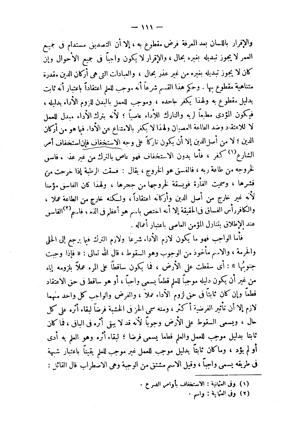 وَحكم هَذَا الْقسم شرعا أَنه مُوجب للْعلم اعتقادا بِاعْتِبَار أَنه ثَابت بِدَلِيل مَقْطُوع بِهِ وَلِهَذَا يكفر جاحده وَمُوجب للْعَمَل بِالْبدنِ للُزُوم الْأَدَاء بدليله فَيكون الْمُؤَدِّي مُطيعًا لرَبه والتارك للْأَدَاء عَاصِيا لِأَنَّهُ بترك الْأَدَاء مبدل للْعَمَل لَا للاعتقاد وضد الطَّاعَة الْعِصْيَان وَلِهَذَا لَا يكفر بالامتناع عَن الْأَدَاء فِيمَا هُوَ من أَرْكَان الدّين لَا من أصل الدّين إِلَّا أَن يكون تَارِكًا على وَجه الاستخفاف فَإِن استخفاف أَمر الشَّارِع كفر فَأَما بِدُونِ الاستخفاف فَهُوَ عَاص بِالتّرْكِ من غير عذر فَاسق لِخُرُوجِهِ من طَاعَة ربه فالفسق هُوَ الْخُرُوج يُقَال فسقت الرّطبَة إِذا خرجت من قشرها وَسميت الْفَأْرَة فويسقة لخروجها من جحرها وَلِهَذَا كَانَ الْفَاسِق مُؤمنا لِأَنَّهُ غير خَارج من أصل الدّين وأركانه اعتقادا وَلكنه خَارج من الطَّاعَة عملا وَالْكَافِر رَأس الْفُسَّاق فِي الْحَقِيقَة إِلَّا أَنه اخْتصَّ باسم هُوَ أعظم فِي الذَّم فاسم الْفَاسِق عِنْد الْإِطْلَاق يتنازل الْمُؤمن العَاصِي بِاعْتِبَار أَعماله