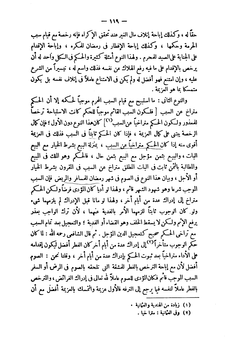 وَالنَّوْع الثَّانِي مَا استبيح مَعَ قيام السَّبَب الْمحرم مُوجبا لحكمه إِلَّا أَن الحكم متراخ عَن السَّبَب (فلكون السَّبَب الْقَائِم مُوجبا للْحكم كَانَت الاستباحة ترخصا للمعذور وَلكَون الحكم متراخيا عَن السَّبَب) كَانَ هَذَا النَّوْع دون الأول فَإِن كَمَال الرُّخْصَة يبتنى على كَمَال الْعَزِيمَة فَإِذا كَانَ الحكم ثَابتا فِي السَّبَب فَذَلِك فِي الْعَزِيمَة أقوى مِنْهُ إِذا كَانَ الحكم متراخيا عَن السَّبَب بِمَنْزِلَة البيع بِشَرْط الْخِيَار مَعَ البيع البات وَالْبيع بِثمن مُؤَجل مَعَ البيع بِثمن حَال فَالْحكم وَهُوَ الْملك فِي الْمَبِيع والمطالبة بِالثّمن ثَابت فِي البات الْمُطلق متراخ عَن السَّبَب فِي المقرون بِشَرْط الْخِيَار أَو الْأَجَل وَبَيَان هَذَا النَّوْع فِي الصَّوْم فِي شهر رَمَضَان للْمُسَافِر وَالْمَرِيض فَإِن السَّبَب الْمُوجب شرعا وَهُوَ شُهُود الشَّهْر قَائِم وَلِهَذَا لَو أديا كَانَ الْمُؤَدى فرضا وَلَكِن الحكم متراخ إِلَى إِدْرَاك عدَّة من أَيَّام أخر وَلِهَذَا لَو مَاتَا قبل الْإِدْرَاك لم يلْزمهُمَا شَيْء وَلَو كَانَ الْوُجُوب ثَابتا للزمهما الْأَمر بالفدية عَنْهُمَا لِأَن ترك الْوَاجِب بِعُذْر يرفع الْإِثْم وَلَكِن لَا يسْقط الْخلف وَهُوَ الْقَضَاء أَو الْفِدْيَة والتعجيل بعد تَمام السَّبَب مَعَ تراخي الحكم صَحِيح كتعجيل الدّين الْمُؤَجل