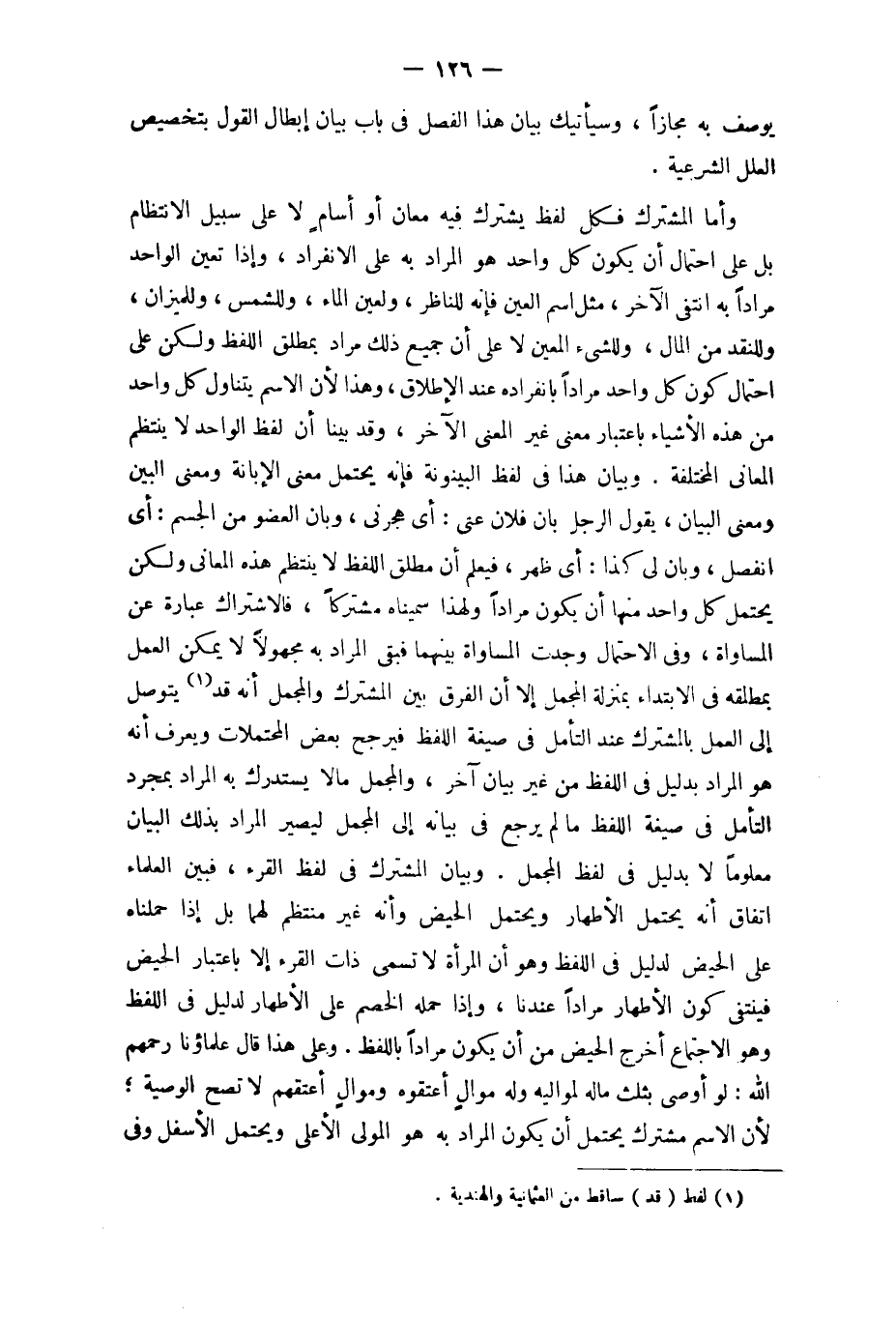 وَبَيَان الْمُشْتَرك فِي لفظ الْقُرْء فَبين الْعلمَاء اتِّفَاق أَنه يحْتَمل الْأَطْهَار وَيحْتَمل الْحيض وَأَنه غير مُنْتَظم لَهما بل إِذا حملناه على الْحيض لدَلِيل فِي اللَّفْظ وَهُوَ أَن الْمَرْأَة لَا تسمى ذَات الْقُرْء إِلَّا بِاعْتِبَار الْحيض فَيَنْتَفِي كَون الْأَطْهَار مرَادا عندنَا وَإِذا حمله الْخصم على الْأَطْهَار لدَلِيل فِي اللَّفْظ وَهُوَ الِاجْتِمَاع أخرج الْحيض من أَن يكون مرَادا بِاللَّفْظِ
