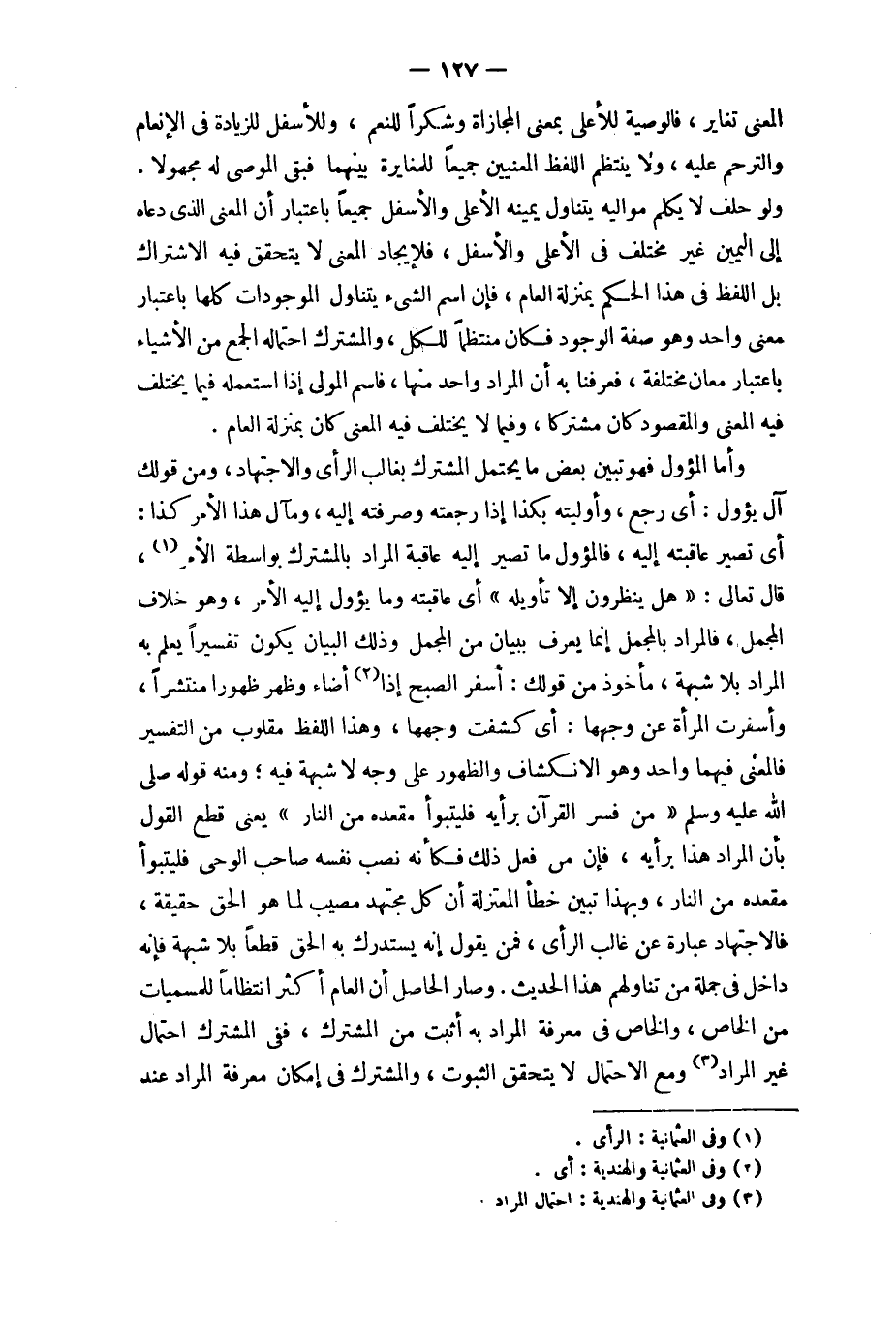 وَأما المؤول فَهُوَ تبين بعض مَا يحْتَمل الْمُشْتَرك بغالب الرَّأْي وَالِاجْتِهَاد وَمن قَوْلك آل يؤول أَي رَجَعَ وأوليته بِكَذَا إِذا رجعته وصرفته إِلَيْهِ ومآل هَذَا الْأَمر كَذَا أَي تصير عاقبته إِلَيْهِ فالمؤول مَا تصير إِلَيْهِ عَاقِبَة المُرَاد بالمشترك بِوَاسِطَة الْأَمر قَالَ تَعَالَى {هَل ينظرُونَ إِلَّا تَأْوِيله} أَي عاقبته وَمَا يؤول إِلَيْهِ الْأَمر وَهُوَ خلاف الْمُجْمل فَالْمُرَاد بالمجمل إِنَّمَا يعرف بِبَيَان من الْمُجْمل وَذَلِكَ الْبَيَان يكون تَفْسِيرا يعلم بِهِ المُرَاد بِلَا شُبْهَة مَأْخُوذ من قَوْلك أَسْفر الصُّبْح إِذا أَضَاء وَظهر ظهورا منتشرا وأسفرت الْمَرْأَة عَن وَجههَا أَي كشفت وَجههَا وَهَذَا اللَّفْظ مقلوب من التَّفْسِير فَالْمَعْنى فيهمَا وَاحِد وَهُوَ الانكشاف والظهور على وَجه لَا شُبْهَة فِيهِ وَمِنْه قَوْله صلى الله عَلَيْهِ وَسلم من فسر الْقُرْآن بِرَأْيهِ فَليَتَبَوَّأ مَقْعَده من النَّار يَعْنِي قطع القَوْل بِأَن المُرَاد هَذَا بِرَأْيهِ فَإِن من فعل ذَلِك فَكَأَنَّهُ نصب نَفسه صَاحب الْوَحْي فَليَتَبَوَّأ مَقْعَده من النَّار وَبِهَذَا تبين خطأ الْمُعْتَزلَة أَن كل مُجْتَهد مُصِيب لما هُوَ الْحق حَقِيقَة فالاجتهاد عبارَة عَن غَالب الرَّأْي فَمن يَقُول إِنَّه يسْتَدرك بِهِ الْحق قطعا بِلَا شُبْهَة فَإِنَّهُ دَاخل فِي جملَة من تناولهم هَذَا الحَدِيث