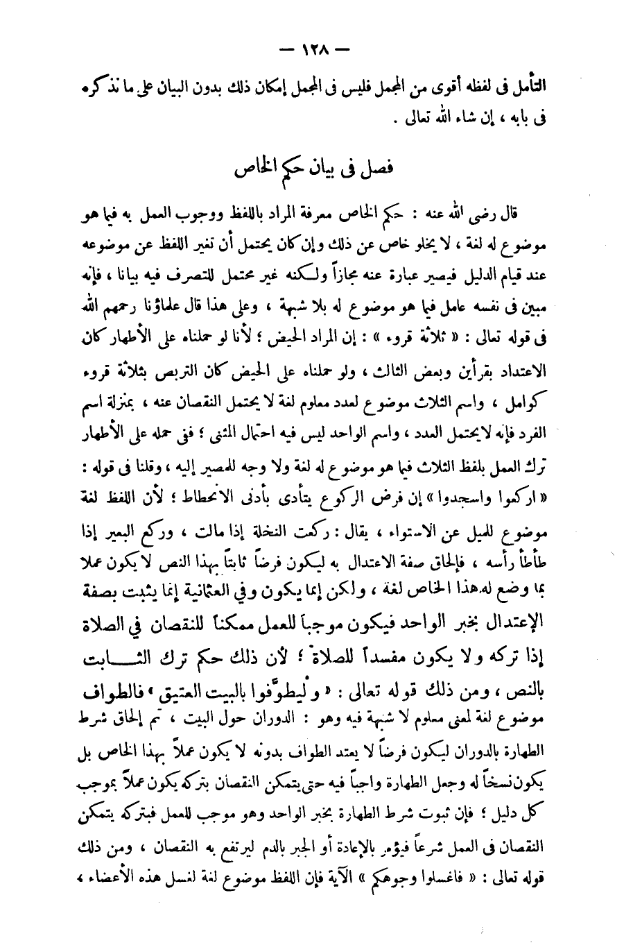 قَالَ رَضِي الله عَنهُ حكم الْخَاص معرفَة المُرَاد بِاللَّفْظِ وَوُجُوب الْعَمَل بِهِ فِيمَا هُوَ مَوْضُوع لَهُ لُغَة لَا يَخْلُو خَاص عَن ذَلِك وَإِن كَانَ يحْتَمل أَن تغير اللَّفْظ عَن مَوْضُوعه عِنْد قيام الدَّلِيل فَيصير عبارَة عَنهُ مجَازًا وَلكنه غير مُحْتَمل للتَّصَرُّف فِيهِ بَيَانا فَإِنَّهُ مُبين فِي نَفسه عَامل فِيمَا هُوَ مَوْضُوع لَهُ بِلَا شُبْهَة وعَلى هَذَا قَالَ عُلَمَاؤُنَا رَحِمهم الله فِي قَوْله تَعَالَى {ثَلَاثَة قُرُوء} إِن المُرَاد الْحيض لأَنا لَو حملناه على الْأَطْهَار كَانَ الِاعْتِدَاد بقرأين وَبَعض الثَّالِث وَلَو حملناه على الْحيض كَانَ التَّرَبُّص بِثَلَاثَة قُرُوء كوامل وَاسم الثَّلَاث مَوْضُوع لعدد مَعْلُوم لُغَة لَا يحْتَمل النُّقْصَان عَنهُ بِمَنْزِلَة اسْم الْفَرد فَإِنَّهُ لَا يحْتَمل الْعدَد وَاسم الْوَاحِد لَيْسَ فِيهِ احْتِمَال الْمثنى فَفِي حمله على الْأَطْهَار ترك الْعَمَل بِلَفْظ الثَّلَاث فِيمَا هُوَ مَوْضُوع لَهُ لُغَة وَلَا وَجه للمصير إِلَيْهِ وَقُلْنَا فِي قَوْله {ارْكَعُوا واسجدوا} إِن فرض الرُّكُوع يتَأَدَّى بِأَدْنَى الانحطاط لِأَن اللَّفْظ لُغَة مَوْضُوع للميل عَن الاسْتوَاء يُقَال ركعت النَّخْلَة إِذا مَالَتْ وَركع الْبَعِير إِذا طأطأ رَأسه فإلحاق صفة الِاعْتِدَال بِهِ ليَكُون فرضا ثَابتا بِهَذَا النَّص لَا يكون عملا بِمَا وضع لَهُ هَذَا الْخَاص لُغَة وَلَكِن إِنَّمَا يكون وَفِي العثمانية إِنَّمَا يثبت بِصفة الِاعْتِدَال بِخَبَر الْوَاحِد فَيكون مُوجبا للْعَمَل مُمكنا للنقصان فِي الصَّلَاة إِذا تَركه وَلَا يكون مُفْسِدا للصَّلَاة لِأَن ذَلِك حكم ترك الثَّابِت بِالنَّصِّ وَمن ذَلِك قَوْله تَعَالَى {وليطوفوا بِالْبَيْتِ الْعَتِيق} فالطواف مَوْضُوع لُغَة لِمَعْنى مَعْلُوم لَا شُبْهَة فِيهِ وَهُوَ الدوران حول الْبَيْت ثمَّ إِلْحَاق شَرط الطَّهَارَة بالدوران ليَكُون فرضا لَا يعْتد الطّواف بِدُونِهِ لَا يكون عملا بِهَذَا الْخَاص بل يكون نسخا لَهُ وَجعل الطَّهَارَة وَاجِبا فِيهِ حَتَّى يتَمَكَّن النُّقْصَان بِتَرْكِهِ يكون عملا بِمُوجب كل دَلِيل فَإِن ثُبُوت شَرط الطَّهَارَة بِخَبَر الْوَاحِد وَهُوَ مُوجب للْعَمَل فبتركه يتَمَكَّن النُّقْصَان فِي الْعَمَل شرعا فَيُؤْمَر بِالْإِعَادَةِ أَو الْجَبْر بِالدَّمِ ليرتفع بِهِ النُّقْصَان وَمن ذَلِك قَوْله تَعَالَى {فَاغْسِلُوا وُجُوهكُم}