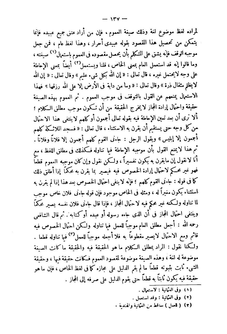 ثمَّ هَذَا لَا يمْنَع القَوْل بِأَن مُوجبه الْإِحَاطَة فِيمَا تنَاوله فَكَذَلِك فِي مُطلق اللَّفْظ مَعَ أَنا لَا نقُول إِن مَا يقرن بِهِ يكون تَفْسِيرا وَلَكِن نقُول وَإِن كَانَ مُوجبه الْعُمُوم قطعا فَهُوَ غير مُحكم لاحْتِمَال إِرَادَة الْخُصُوص فِيهِ فَيصير بِمَا يقرن بِهِ محكما إِذا أطلق ذَلِك كَمَا فِي قَوْله جَاءَنِي الْقَوْم كلهم فَإِنَّهُ لَا يَنْفِي احْتِمَال الْخُصُوص بعد هَذَا إِذا لم يقرن بِهِ اسْتثِْنَاء يكون مغيرا لَهُ وَمثله فِي الْخَاص مَوْجُود فَإِن قَوْله جَاءَنِي فلَان خَاص مُوجب لما تنَاوله وَلكنه غير مُحكم فِيهِ لاحْتِمَال الْمجَاز فَإِذا قَالَ جَاءَنِي فلَان نَفسه يصير محكما وينتفي احْتِمَال الْمجَاز فِي أَن الَّذِي جَاءَهُ رَسُوله أَو عَبده أَو كِتَابه