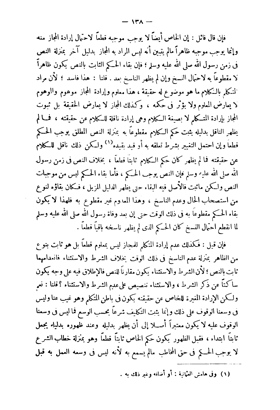 فَإِن قَالَ قَائِل إِن الْخَاص أَيْضا لَا يُوجب مُوجبه قطعا لاحْتِمَال إِرَادَة الْمجَاز مِنْهُ وَإِنَّمَا يُوجب مُوجبه ظَاهرا مَا لم يتَبَيَّن أَنه لَيْسَ المُرَاد بِهِ الْمجَاز بِدَلِيل آخر بِمَنْزِلَة النَّص فِي زمن رَسُول الله صلى الله عَلَيْهِ وَسلم فَإِن بَقَاء الحكم الثَّابِت بِالنَّصِّ يكون ظَاهرا لَا مَقْطُوعًا بِهِ لاحْتِمَال النّسخ وَإِن لم يظْهر النَّاسِخ بعد
