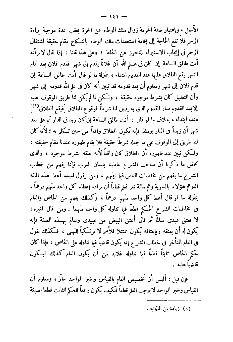 بِاعْتِبَار الأَصْل وَبِاعْتِبَار صفة الْحُرْمَة زَوَال ملك الْوَطْء عَن الْحرَّة يعقب عدَّة مُوجبَة بَرَاءَة الرَّحِم فَلَا تقع الْحَاجة إِلَى إِقَامَة استحداث ملك الْوَطْء بِالنِّكَاحِ مقَام حَقِيقَة اشْتِغَال الرَّحِم فِي إِيجَاب الِاسْتِبْرَاء للتحرز عَن الْخَلْط وعَلى هَذَا قُلْنَا إِذا قَالَ لامْرَأَته أَنْت طَالِق السَّاعَة إِن كَانَ فِي علم الله أَن فلَانا يقدم إِلَى شهر فَقدم فلَان بعد تَمام الشَّهْر يَقع الطَّلَاق عَلَيْهَا عِنْد الْقدوم ابْتِدَاء بِمَنْزِلَة مَا لَو قَالَ أَنْت طَالِق السَّاعَة إِن قدم فلَان إِلَى شهر وَمَعْلُوم أَن بعد قدومه قد تبين أَنه كَانَ فِي علم الله قدومه إِلَى شهر وَأَن التَّعْلِيق كَانَ بِشَرْط مَوْجُود حَقِيقَة وَلَكِن لما لم يكن لنا طَرِيق الْوُقُوف عَلَيْهِ إِلَّا بعد الْقدوم صَار الْقدوم الَّذِي بِهِ يتَبَيَّن لنا شرطا لوُقُوع الطَّلَاق (فَيَقَع الطَّلَاق) عِنْده ابْتِدَاء بِخِلَاف مَا لَو قَالَ أَنْت طَالِق السَّاعَة إِن كَانَ زيد فِي الدَّار ثمَّ علم بعد شهر أَن زيدا فِي الدَّار يَوْمئِذٍ فَإِنَّهُ يكون الطَّلَاق وَاقعا من حِين تكلم بِهِ لِأَنَّهُ كَانَ لنا طَرِيق إِلَى الْوُقُوف على مَا جعله شرطا حَقِيقَة فَلَا يُقَام ظُهُوره عندنَا مقَام حَقِيقَته وَلَكِن تبين عِنْد ظُهُوره أَن الطَّلَاق كَانَ وَاقعا لِأَنَّهُ علقه بِشَرْط مَوْجُود وَالَّذِي تحقق مَا ذكرنَا أَن صَاحب الشَّرْع خاطبنا بِلِسَان الْعَرَب فَإِنَّمَا يفهم من خطاب الشَّرْع مَا يفهم من مخاطبات النَّاس فِيمَا بَينهم وَمن يَقُول لعَبْدِهِ أعْط هَذِه الْمِائَة الدِّرْهَم هَؤُلَاءِ بِالسَّوِيَّةِ وهم مائَة نفر نعلم قطعا أَن مُرَاده إِعْطَاء كل وَاحِد مِنْهُم درهما بِمَنْزِلَة مَا لَو قَالَ أعْط كل وَاحِد مِنْهُم درهما وَكَذَلِكَ يفهم من الْخَاص وَالْعَام فِي مخاطبات الشَّرْع الحكم قطعا فِيمَا تنَاوله كل وَاحِد مِنْهُمَا