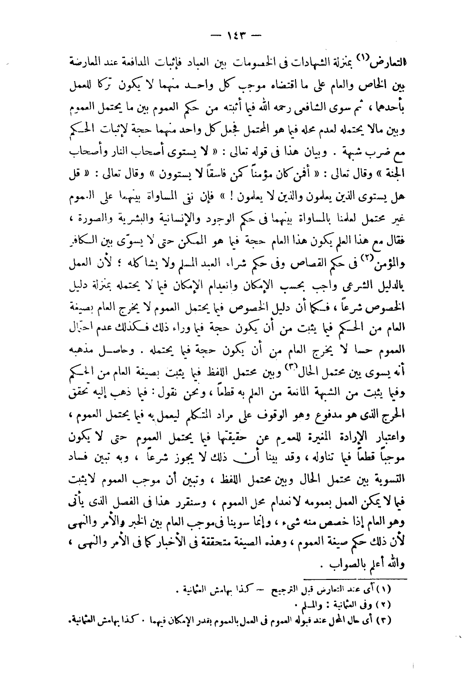 وَحَاصِل مذْهبه أَنه يُسَوِّي بَين مُحْتَمل الْحَال وَبَين مُحْتَمل اللَّفْظ فِيمَا يثبت بِصِيغَة الْعَام من الحكم وَفِيمَا يثبت من الشُّبْهَة الْمَانِعَة من الْعلم بِهِ قطعا وَنحن نقُول فِيمَا ذهب إِلَيْهِ تحقق الْحَرج الَّذِي هُوَ مَدْفُوع وَهُوَ الْوُقُوف على مُرَاد الْمُتَكَلّم ليعْمَل بِهِ فِيمَا يحْتَمل الْعُمُوم وَاعْتِبَار الْإِرَادَة الْمُغيرَة للْعُمُوم عَن حَقِيقَتهَا فِيمَا يحْتَمل الْعُمُوم حَتَّى لَا يكون مُوجبا قطعا فِيمَا تنَاوله وَقد بَينا أَن ذَلِك لَا يجوز شرعا وَبِه تبين فَسَاد التَّسْوِيَة بَين مُحْتَمل الْحَال وَبَين مُحْتَمل اللَّفْظ وَتبين أَن مُوجب الْعُمُوم لَا يثبت فِيمَا لَا يُمكن الْعَمَل بِعُمُومِهِ لِانْعِدَامِ مَحل الْعُمُوم وسنقرر هَذَا فِي الْفَصْل الَّذِي يَأْتِي وَهُوَ الْعَام إِذا خصص مِنْهُ شَيْء وَإِنَّمَا سوينا فِي مُوجب الْعَام بَين الْخَبَر وَالْأَمر وَالنَّهْي لِأَن ذَلِك حكم صِيغَة الْعُمُوم وَهَذِه الصِّيغَة متحققة فِي الْأَخْبَار كَمَا فِي الْأَمر وَالنَّهْي وَالله أعلم بِالصَّوَابِ