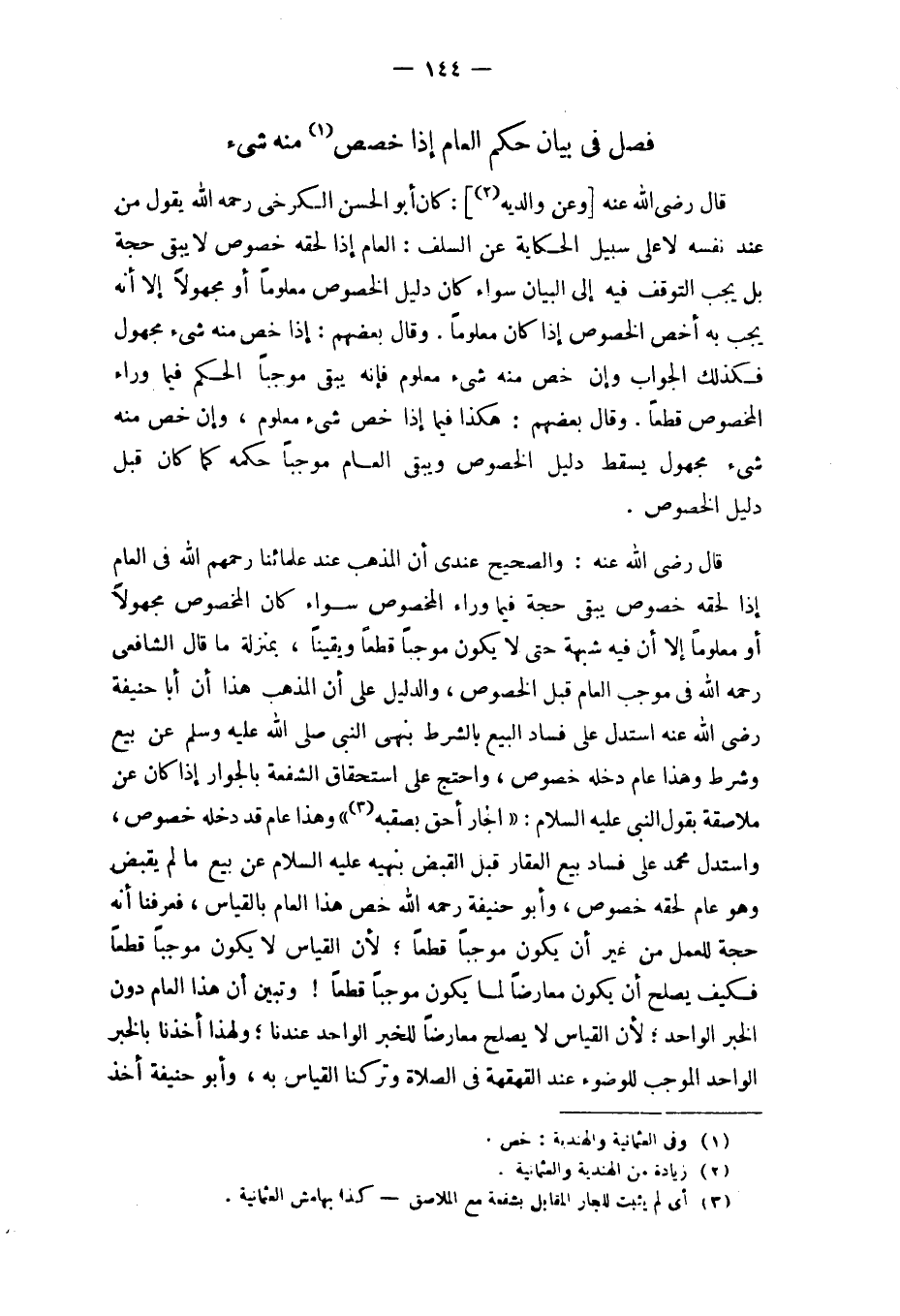 قَالَ رَضِي الله عَنهُ وَالصَّحِيح عِنْدِي أَن الْمَذْهَب عِنْد عُلَمَائِنَا رَحِمهم الله فِي الْعَام إِذا لحقه خُصُوص يبْقى حجَّة فِيمَا وَرَاء الْمَخْصُوص سَوَاء كَانَ الْمَخْصُوص مَجْهُولا أَو مَعْلُوما إِلَّا أَن فِيهِ شُبْهَة حَتَّى لَا يكون مُوجبا قطعا ويقينا بِمَنْزِلَة مَا قَالَ الشَّافِعِي رَحمَه الله فِي مُوجب الْعَام قبل الْخُصُوص وَالدَّلِيل على أَن الْمَذْهَب هَذَا أَن أَبَا حنيفَة رَضِي الله عَنهُ اسْتدلَّ على فَسَاد البيع بِالشّرطِ بنهي النَّبِي صلى الله عَلَيْهِ وَسلم عَن بيع وَشرط وَهَذَا عَام دخله خُصُوص وَاحْتج على اسْتِحْقَاق الشُّفْعَة بالجوار إِذا كَانَ عَن ملاصقة بقول النَّبِي عَلَيْهِ السَّلَام الْجَار أَحَق بصقبه وَهَذَا عَام قد دخله خُصُوص وَاسْتدلَّ مُحَمَّد على فَسَاد بيع الْعقار قبل الْقَبْض بنهيه عَلَيْهِ السَّلَام عَن بيع مَا لم يقبض وَهُوَ عَام لحقه خُصُوص وَأَبُو حنيفَة رَحمَه الله خص هَذَا الْعَام بِالْقِيَاسِ فَعرفنَا أَنه حجَّة للْعَمَل من غير أَن يكون مُوجبا قطعا لِأَن الْقيَاس لَا يكون مُوجبا قطعا فَكيف يصلح أَن يكون مُعَارضا لما يكون مُوجبا قطعا وَتبين أَن هَذَا الْعَام دون الْخَبَر الْوَاحِد لِأَن الْقيَاس لَا يصلح مُعَارضا للْخَبَر الْوَاحِد عندنَا وَلِهَذَا أَخذنَا بالْخبر الْوَاحِد الْمُوجب للْوُضُوء عِنْد القهقهة فِي الصَّلَاة وَتَركنَا الْقيَاس بِهِ وَأَبُو حنيفَة أَخذ