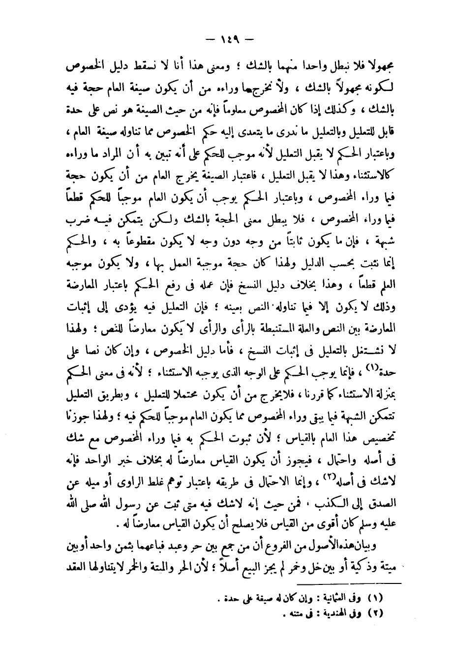 نبطل وَاحِدًا مِنْهُمَا بِالشَّكِّ وَمعنى هَذَا أَنا لَا نسقط دَلِيل الْخُصُوص لكَونه مَجْهُولا بِالشَّكِّ وَلَا نخرج مَا وَرَاءه من أَن يكون صِيغَة الْعَام حجَّة فِيهِ بِالشَّكِّ وَكَذَلِكَ إِذا كَانَ الْمَخْصُوص مَعْلُوما فَإِنَّهُ من حَيْثُ الصِّيغَة هُوَ نَص على حِدة قَابل للتَّعْلِيل وبالتعليل مَا نَدْرِي مَا يتَعَدَّى إِلَيْهِ حكم الْخُصُوص مِمَّا تنَاوله صِيغَة الْعَام وَبِاعْتِبَار الحكم لَا يقبل التَّعْلِيل لِأَنَّهُ مُوجب للْحكم على أَنه تبين بِهِ أَن المُرَاد مَا وَرَاءه كالاستثناء وَهَذَا لَا يقبل التَّعْلِيل فاعتبار الصِّيغَة يخرج الْعَام من أَن يكون حجَّة فِيمَا وَرَاء الْمَخْصُوص وَبِاعْتِبَار الحكم يُوجب أَن يكون الْعَام مُوجبا للْحكم قطعا فِيمَا وَرَاء الْمَخْصُوص فَلَا يبطل معنى الْحجَّة بِالشَّكِّ وَلَكِن يتَمَكَّن فِيهِ ضرب شُبْهَة فَإِن مَا يكون ثَابتا من وَجه دون وَجه لَا يكون مَقْطُوعًا بِهِ وَالْحكم إِنَّمَا نثبت بِحَسب الدَّلِيل وَلِهَذَا كَانَ حجَّة مُوجبَة الْعَمَل بهَا وَلَا يكون مُوجبه الْعلم قطعا وَهَذَا بِخِلَاف دَلِيل النّسخ فَإِن عمله فِي رفع الحكم بِاعْتِبَار الْمُعَارضَة وَذَلِكَ لَا يكون إِلَّا فِيمَا تنَاوله النَّص بِعَيْنِه فَإِن التَّعْلِيل فِيهِ يُؤَدِّي إِلَى إِثْبَات الْمُعَارضَة بَين النَّص وَالْعلَّة المستنبطة بِالرَّأْيِ والرأي لَا يكون مُعَارضا للنَّص وَلِهَذَا لَا نشتغل بِالتَّعْلِيلِ فِي إِثْبَات النّسخ فَأَما دَلِيل الْخُصُوص وَإِن كَانَ نصا على حِدة فَإِنَّمَا يُوجب الحكم على الْوَجْه الَّذِي يُوجِبهُ الِاسْتِثْنَاء لِأَنَّهُ فِي معنى الحكم بِمَنْزِلَة الِاسْتِثْنَاء كَمَا قَررنَا فَلَا يخرج من أَن يكون مُحْتملا للتَّعْلِيل وبطريق التَّعْلِيل تتمكن الشُّبْهَة فِيمَا يبْقى وَرَاء الْمَخْصُوص مِمَّا يكون الْعَام مُوجبا للْحكم فِيهِ وَلِهَذَا جَوَّزنَا تَخْصِيص هَذَا الْعَام بِالْقِيَاسِ لِأَن ثُبُوت الحكم بِهِ فِيمَا وَرَاء الْمَخْصُوص مَعَ شكّ فِي أَصله وَاحْتِمَال فَيجوز أَن يكون الْقيَاس مُعَارضا لَهُ بِخِلَاف خبر الْوَاحِد فَإِنَّهُ لَا شكّ فِي أَصله وَإِنَّمَا الِاحْتِمَال فِي طَرِيقه بِاعْتِبَار توهم غلط الرَّاوِي أَو ميله عَن الصدْق إِلَى الْكَذِب فَمن حَيْثُ إِنَّه لَا شكّ فِيهِ مَتى ثَبت عَن رَسُول الله صلى الله عَلَيْهِ وَسلم كَانَ أقوى من الْقيَاس فَلَا يصلح أَن يكون الْقيَاس مُعَارضا لَهُ