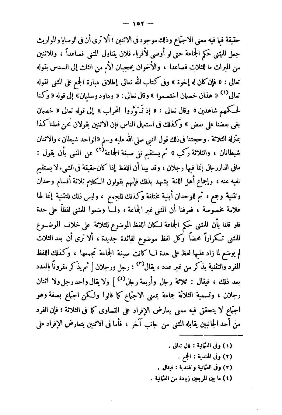 وَحجَّتنَا فِي ذَلِك قَول النَّبِي صلى الله عَلَيْهِ وَسلم الْوَاحِد شَيْطَان والاثنان شيطانان وَالثَّلَاثَة ركب ثمَّ يَسْتَقِيم نفي صِيغَة الْجَمَاعَة عَن الْمثنى بِأَن يَقُول مَا فِي الدَّار رجال إِنَّمَا فِيهَا رجلَانِ وَقد بَينا أَن اللَّفْظ إِذا كَانَ حَقِيقَة فِي الشَّيْء لَا يَسْتَقِيم نَفْيه عَنهُ وَإِجْمَاع أهل اللُّغَة يشْهد بذلك فَإِنَّهُم يَقُولُونَ الْكَلَام ثَلَاثَة أَقسَام وحدان وتثنية وَجمع ثمَّ للوحدان أبنية مُخْتَلفَة وَكَذَلِكَ للْجمع وَلَيْسَ ذَلِك للتثنية إِنَّمَا لَهَا عَلامَة مَخْصُوصَة فَعرفنَا أَن الْمثنى غير الْجَمَاعَة وَلما وضعُوا للمثنى لفظا على حِدة فَلَو قُلْنَا بِأَن للمثنى حكم الْجَمَاعَة لَكَانَ اللَّفْظ الْمَوْضُوع للثَّلَاثَة على خلاف الْمَوْضُوع للمثنى تَكْرَارا مَحْضا وكل لفظ مَوْضُوع لفائدة جَدِيدَة أَلا ترى أَن بعد الثَّلَاث لم يوضع لما زَاد عَلَيْهَا لفظ على حِدة لما كَانَت صِيغَة الْجَمَاعَة تجمعها وَكَذَلِكَ اللَّفْظ الْمُفْرد والتثنية يذكر من غير عدد يُقَال رجل ورجلان (ثمَّ يذكر مَقْرُونا بِالْعدَدِ بعد ذَلِك فَيُقَال ثَلَاثَة رجال وَأَرْبَعَة رجال) وَلَا يُقَال وَاحِد رجل وَلَا اثْنَان رجلَانِ وَتَسْمِيَة الثَّلَاثَة جمَاعَة بِمَعْنى الِاجْتِمَاع كَمَا قَالُوا وَلَكِن اجْتِمَاع بِصفة وَهُوَ اجْتِمَاع لَا يتَحَقَّق أحد الْجَانِبَيْنِ يُقَابله الْمثنى من جَانب آخر فَأَما فِي الِاثْنَيْنِ يتعارض الْإِفْرَاد على التَّسَاوِي من حَيْثُ إِن كل وَاحِد من الْجَانِبَيْنِ فَرد فَعِنْدَ الانضمام يكون اسْم الْمثنى حَقِيقَة فيهمَا لَا اسْم الْجَمَاعَة وَتَأْويل الحَدِيث أَن فِي حكم الاصطفاف خلف الإِمَام الِاثْنَان فَمَا فَوْقهمَا جمَاعَة فقد بَينا الْمَعْنى فِيهِ فَأَما فِي الْمَوَارِيث فاستحقاق الِاثْنَيْنِ الثُّلثَيْنِ لَيْسَ بِالنَّصِّ الْوَارِد بِعِبَارَة الْجَمَاعَة وَهُوَ قَوْله تَعَالَى {فَلَهُنَّ ثلثا مَا ترك} إِنَّمَا ذَلِك للثلاث فِيهِ معنى يُعَارض الْإِفْرَاد على