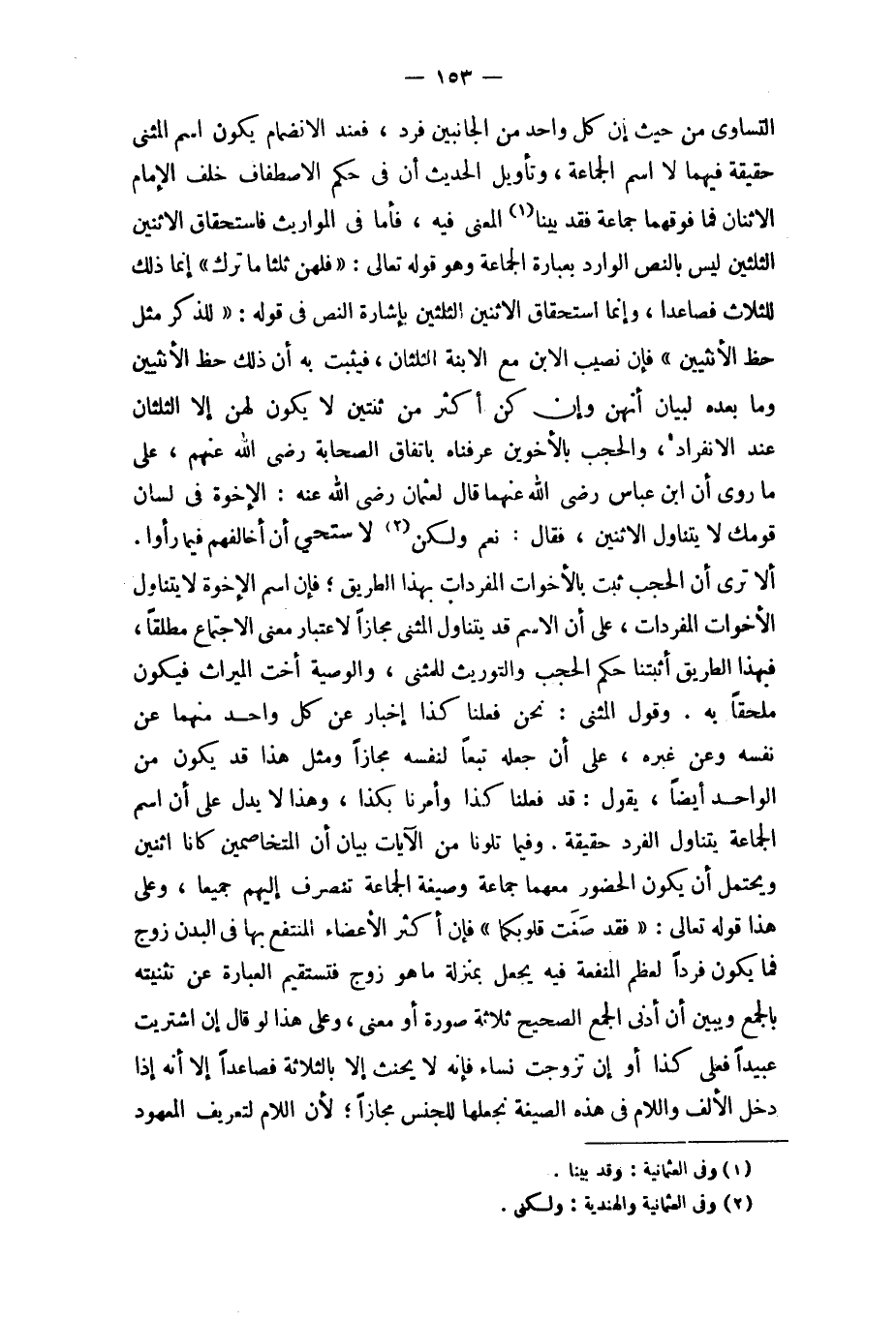 التَّسَاوِي كَمَا فِي الثَّلَاثَة فَإِن الْفَرد من فَصَاعِدا وَإِنَّمَا اسْتِحْقَاق الِاثْنَيْنِ الثُّلثَيْنِ بِإِشَارَة النَّص فِي قَوْله {للذّكر مثل حَظّ الْأُنْثَيَيْنِ} فَإِن نصيب الابْن مَعَ الِابْنَة الثُّلُثَانِ فَيثبت بِهِ أَن ذَلِك حَظّ الْأُنْثَيَيْنِ وَمَا بعده لبَيَان أَنَّهُنَّ وَإِن كن أَكثر من اثْنَتَيْنِ لَا يكون لَهُنَّ إِلَّا الثُّلُثَانِ عِنْد الِانْفِرَاد والحجب بالأخوين عَرفْنَاهُ بِاتِّفَاق الصَّحَابَة رَضِي الله عَنْهُم على مَا رُوِيَ أَن ابْن عَبَّاس رَضِي الله عَنْهُمَا قَالَ لعُثْمَان رَضِي الله عَنهُ الْإِخْوَة فِي لِسَان قَوْمك لَا يتَنَاوَل الِاثْنَيْنِ فَقَالَ نعم وَلَكِن لاستحي أَن أخالفهم فِيمَا رَأَوْا