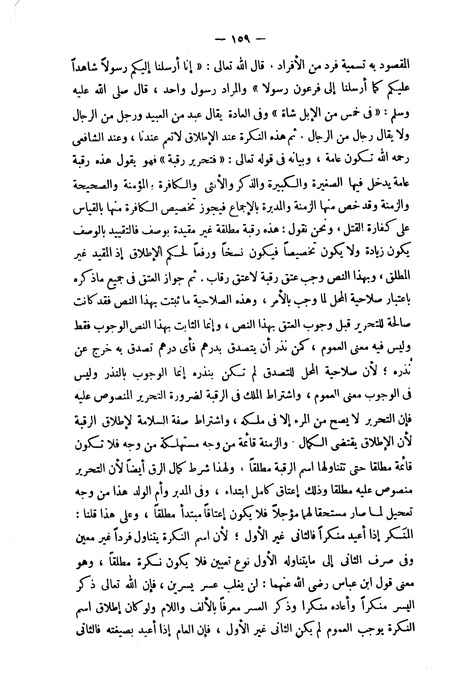 ثمَّ هَذِه النكرَة عِنْد الْإِطْلَاق لَا تعم عندنَا وَعند الشَّافِعِي رَحمَه الله تكون عَامَّة وَبَيَانه فِي قَوْله تَعَالَى {فَتَحْرِير رَقَبَة} فَهُوَ يَقُول هَذِه رَقَبَة عَامَّة يدْخل فِيهَا الصَّغِيرَة والكبيرة وَالذكر وَالْأُنْثَى والكافرة والمؤمنة والصحيحة والزمنة وَقد خص مِنْهَا الزمنة والمدبرة بِالْإِجْمَاع فَيجوز تَخْصِيص الْكَافِرَة مِنْهَا بِالْقِيَاسِ على كَفَّارَة الْقَتْل وَنحن نقُول هَذِه رَقَبَة مُطلقَة غير مُقَيّدَة بِوَصْف فالتقييد بِالْوَصْفِ يكون زِيَادَة وَلَا يكون تَخْصِيصًا فَيكون نسخا ورفعا لحكم الْإِطْلَاق إِذْ الْمُقَيد غير الْمُطلق وَبِهَذَا النَّص وَجب عتق رَقَبَة لَا عتق رِقَاب