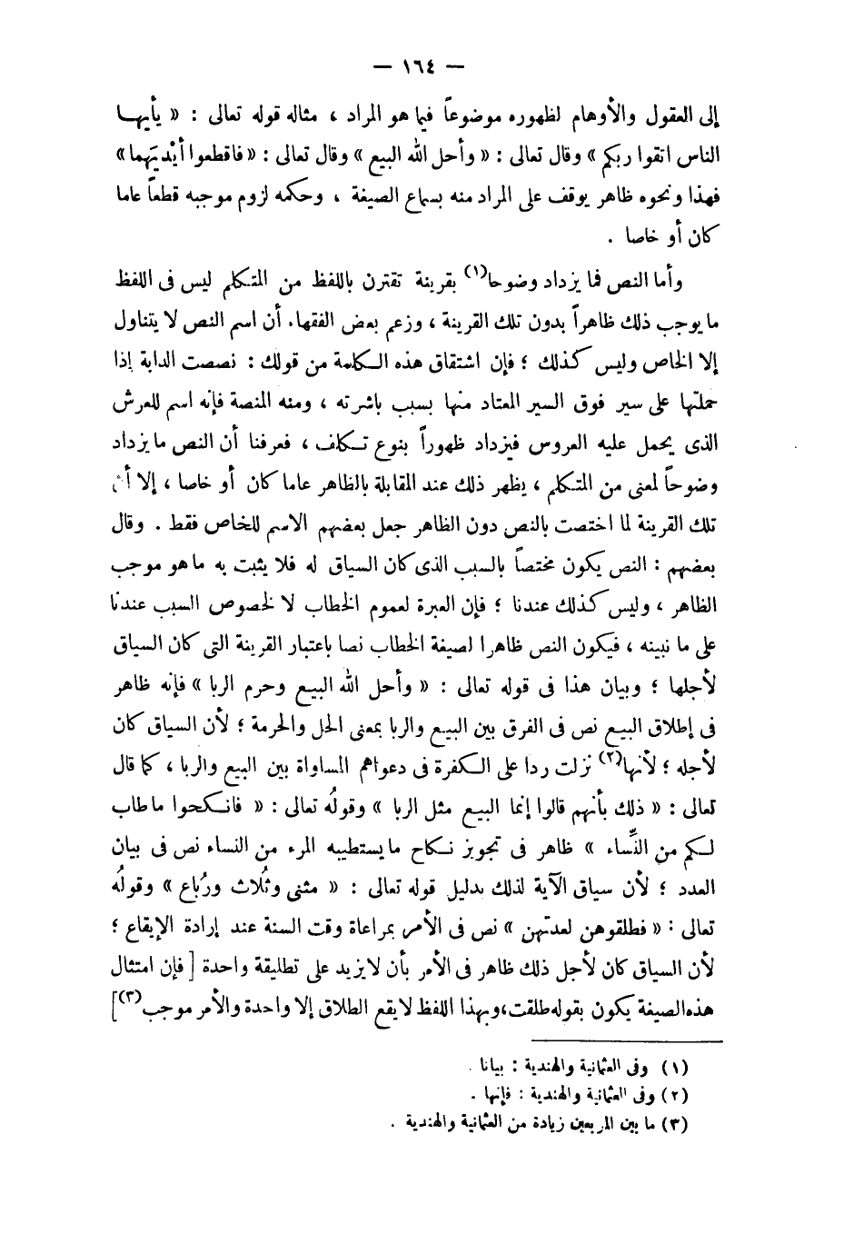 وَأما النَّص فَمَا يزْدَاد وضوحا بِقَرِينَة تقترن بِاللَّفْظِ من الْمُتَكَلّم لَيْسَ فِي اللَّفْظ مَا يُوجب ذَلِك ظَاهرا بِدُونِ تِلْكَ الْقَرِينَة وَزعم بعض الْفُقَهَاء أَن اسْم النَّص لَا يتَنَاوَل إِلَّا الْخَاص وَلَيْسَ كَذَلِك فَإِن اشتقاق هَذِه الْكَلِمَة من قَوْلك نصصت الدَّابَّة إِذا حملتها على سير فَوق السّير الْمُعْتَاد مِنْهَا بِسَبَب باشرته وَمِنْه المنصة فَإِنَّهُ اسْم للعرش الَّذِي يحمل عَلَيْهِ الْعَرُوس فَيَزْدَاد ظهورا بِنَوْع تكلّف فَعرفنَا أَن النَّص مَا يزْدَاد وضوحا لِمَعْنى من الْمُتَكَلّم يظْهر ذَلِك عِنْد الْمُقَابلَة بِالظَّاهِرِ عَاما كَانَ أَو خَاصّا إِلَّا أَن تِلْكَ الْقَرِينَة لما اخْتصّت بِالنَّصِّ دون الظَّاهِر جعل بَعضهم الِاسْم للخاص فَقَط