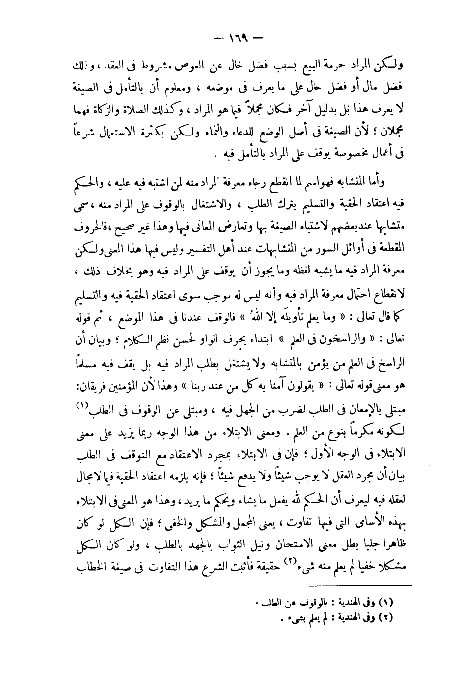 وَأما الْمُتَشَابه فَهُوَ اسْم لما انْقَطع رَجَاء معرفَة المُرَاد مِنْهُ لمن اشْتبهَ فِيهِ عَلَيْهِ وَالْحكم فِيهِ اعْتِقَاد الحقية وَالتَّسْلِيم بترك الطّلب والاشتغال بِالْوُقُوفِ على المُرَاد مِنْهُ سمي متشابها عِنْد بَعضهم لاشتباه الصِّيغَة بهَا وتعارض الْمعَانِي فِيهَا وَهَذَا غير صَحِيح فالحروف الْمُقطعَة فِي أَوَائِل السُّور من المتشابهات عِنْد أهل التَّفْسِير وَلَيْسَ فِيهَا هَذَا الْمَعْنى وَلَكِن معرفَة المُرَاد فِيهِ مَا يشبه لَفظه وَمَا يجوز أَن يُوقف على المُرَاد فِيهِ وَهُوَ بِخِلَاف ذَلِك لانْقِطَاع احْتِمَال معرفَة المُرَاد فِيهِ وَأَنه لَيْسَ لَهُ مُوجب سوى اعْتِقَاد الحقية فِيهِ وَالتَّسْلِيم كَمَا قَالَ تَعَالَى {وَمَا يعلم تَأْوِيله إِلَّا الله} فالوقف عندنَا فِي هَذَا الْموضع ثمَّ قَوْله تَعَالَى {والراسخون فِي الْعلم} ابْتِدَاء بِحرف الْوَاو لحسن نظم الْكَلَام وَبَيَان أَن الراسخ فِي الْعلم من يُؤمن بالمتشابه وَلَا يشْتَغل بِطَلَب المُرَاد فِيهِ بل يقف فِيهِ مُسلما هُوَ معنى قَوْله تَعَالَى {يَقُولُونَ آمنا بِهِ كل من عِنْد رَبنَا} وَهَذَا لِأَن الْمُؤمنِينَ فريقان مبتلي بالإمعان فِي الطّلب لضرب من الْجَهْل فِيهِ ومبتلي عَن الْوُقُوف فِي الطّلب لكَونه مكرما بِنَوْع من الْعلم