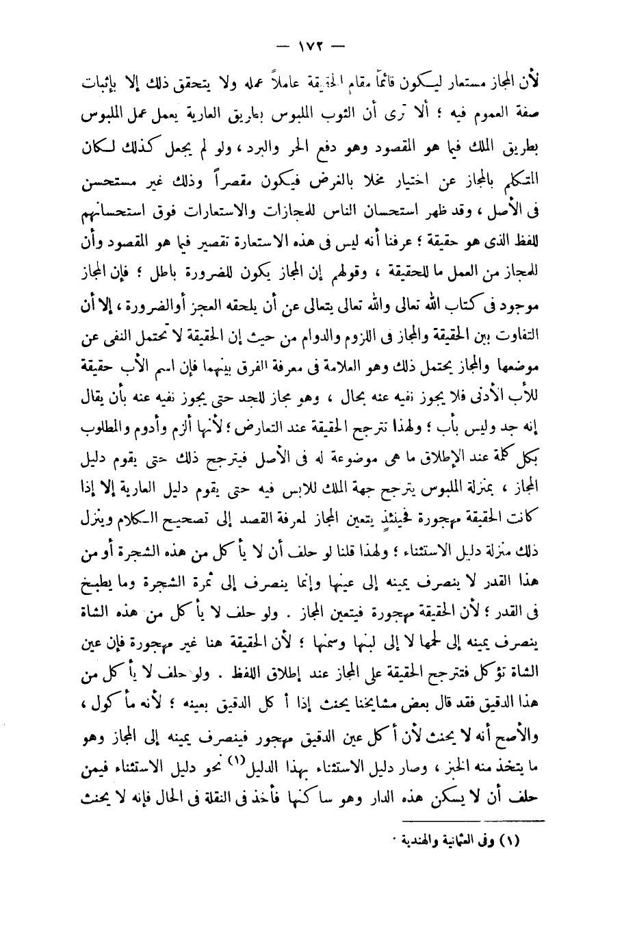 لِأَن الْمجَاز مستعار ليَكُون قَائِما مقَام الْحَقِيقَة عَاملا عمله وَلَا يتَحَقَّق ذَلِك إِلَّا بِإِثْبَات صفة الْعُمُوم فِيهِ أَلا ترى أَن الثَّوْب الملبوس بطرِيق الْعَارِية يعْمل عمل الملبوس بطرِيق الْملك فِيمَا هُوَ الْمَقْصُود وَهُوَ دفع الْحر وَالْبرد وَلَو لم يَجْعَل كَذَلِك لَكَانَ الْمُتَكَلّم بالمجاز عَن اخْتِيَار مخلا بالغرض فَيكون مقصرا وَذَلِكَ غير مستحسن فِي الأَصْل وَقد ظهر اسْتِحْسَان النَّاس للمجازات والاستعارات فَوق استحسانهم للفظ الَّذِي هُوَ حَقِيقَة عرفنَا أَنه لَيْسَ فِي هَذِه الِاسْتِعَارَة تَقْصِير فِيمَا هُوَ الْمَقْصُود وَأَن للمجاز من الْعَمَل مَا للْحَقِيقَة وَقَوْلهمْ إِن الْمجَاز يكون للضَّرُورَة بَاطِل فَإِن الْمجَاز مَوْجُود فِي كتاب الله تَعَالَى وَالله تَعَالَى يتعالى عَن أَن يلْحقهُ الْعَجز أَو الضَّرُورَة إِلَّا أَن التَّفَاوُت بَين الْحَقِيقَة وَالْمجَاز فِي اللُّزُوم والدوام من حَيْثُ إِن الْحَقِيقَة لَا تحْتَمل النَّفْي عَن موضعهَا وَالْمجَاز يحْتَمل ذَلِك وَهُوَ الْعَلامَة فِي معرفَة الْفرق بَينهمَا فَإِن اسْم الْأَب حَقِيقَة للْأَب الْأَدْنَى فَلَا يجوز نَفْيه عَنهُ بِحَال وَهُوَ مجَاز للْجدّ حَتَّى يجوز نَفْيه عَنهُ بِأَن يُقَال إِنَّه جد وَلَيْسَ بأب وَلِهَذَا تترجح الْحَقِيقَة عِنْد التَّعَارُض لِأَنَّهَا ألزم وأدوم وَالْمَطْلُوب بِكُل كلمة عِنْد الْإِطْلَاق مَا هِيَ مَوْضُوعَة لَهُ فِي الأَصْل فيترجح ذَلِك حَتَّى يقوم دَلِيل الْمجَاز بِمَنْزِلَة الملبوس يتَرَجَّح جِهَة الْملك للابس فِيهِ حَتَّى يقوم دَلِيل الْعَارِية إِلَّا إِذا كَانَت الْحَقِيقَة مهجورة فَحِينَئِذٍ يتَعَيَّن الْمجَاز لمعْرِفَة الْقَصْد إِلَى تَصْحِيح الْكَلَام وَينزل ذَلِك منزلَة دَلِيل الِاسْتِثْنَاء وَلِهَذَا قُلْنَا لَو حلف أَن لَا يَأْكُل من هَذِه الشَّجَرَة أَو من هَذَا الْقدر لَا ينْصَرف يَمِينه إِلَى عينهَا وَإِنَّمَا ينْصَرف إِلَى ثَمَرَة الشَّجَرَة وَمَا يطْبخ فِي الْقدر لِأَن الْحَقِيقَة مهجورة فَيتَعَيَّن الْمجَاز