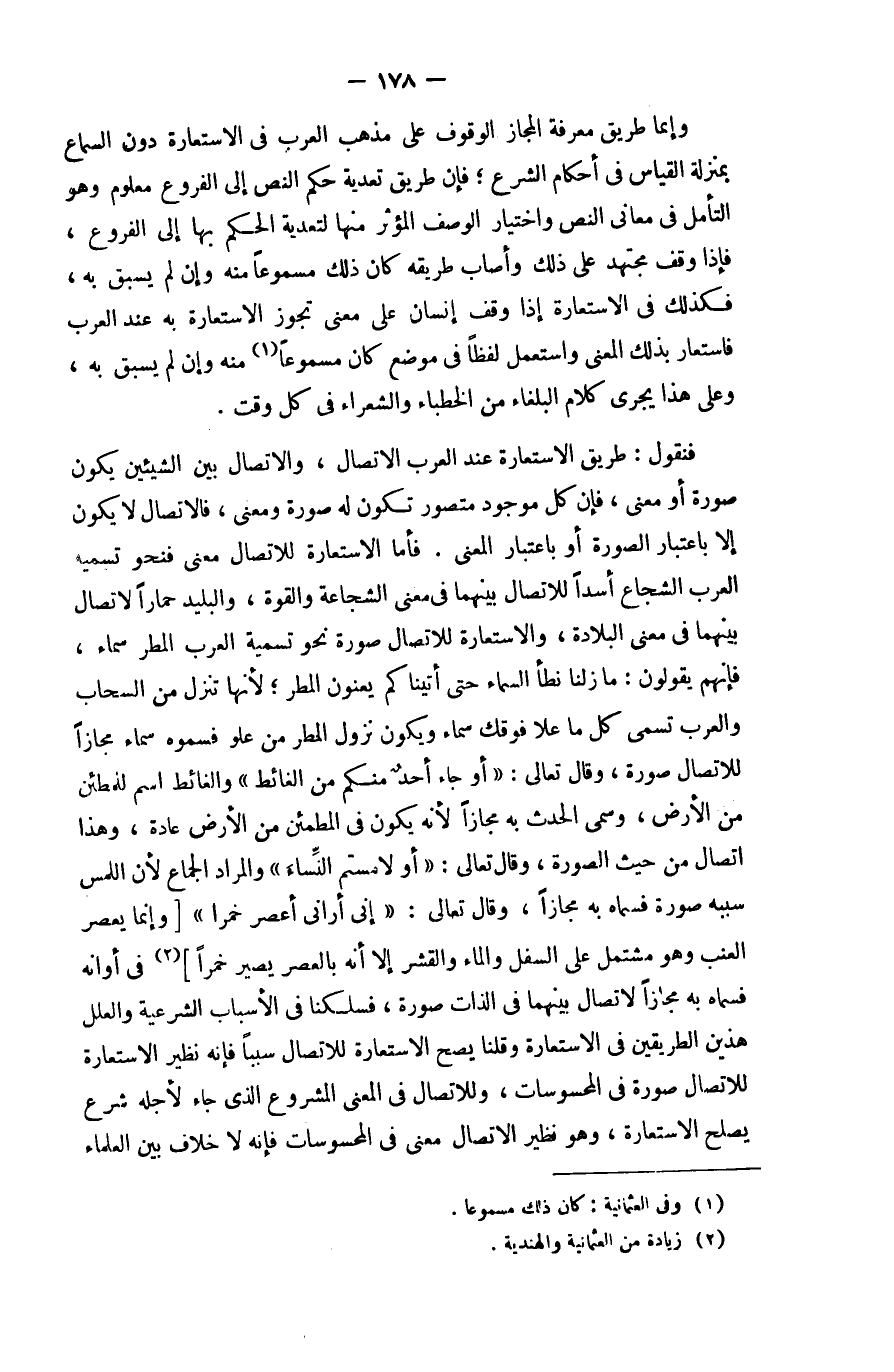 وَإِنَّمَا طَرِيق معرفَة الْمجَاز الْوُقُوف على مَذْهَب الْعَرَب فِي الِاسْتِعَارَة دون السماع بِمَنْزِلَة الْقيَاس فِي أَحْكَام الشَّرْع فَإِن طَرِيق تَعديَة حكم النَّص إِلَى الْفُرُوع مَعْلُوم وَهُوَ التَّأَمُّل فِي مَعَاني النَّص وَاخْتِيَار الْوَصْف الْمُؤثر مِنْهَا لتعدية الحكم بهَا إِلَى الْفُرُوع فَإِذا وقف مُجْتَهد على ذَلِك وَأصَاب طَرِيقه كَانَ ذَلِك مسموعا مِنْهُ وَإِن لم يسْبق بِهِ فَكَذَلِك فِي الِاسْتِعَارَة إِذا وقف إِنْسَان على معنى تجوز الِاسْتِعَارَة بِهِ عِنْد الْعَرَب فاستعار بذلك الْمَعْنى وَاسْتعْمل لفظا فِي مَوضِع كَانَ مسموعا مِنْهُ وَإِن لم يسْبق بِهِ وعَلى هَذَا يجْرِي كَلَام البلغاء من الخطباء وَالشعرَاء فِي كل وَقت