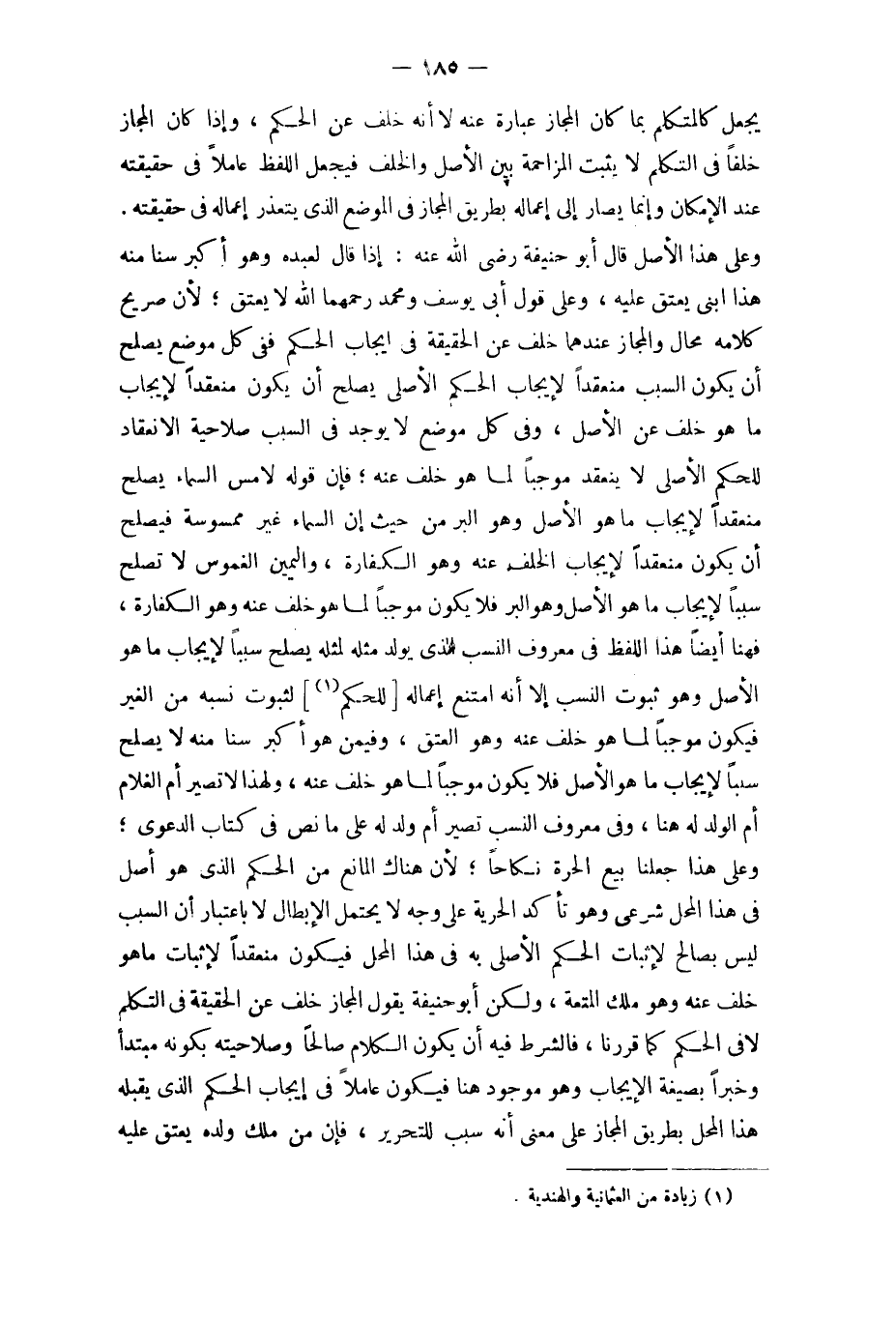 وعَلى هَذَا الأَصْل قَالَ أَبُو حنيفَة رَضِي الله عَنهُ إِذا قَالَ لعَبْدِهِ وَهُوَ أكبر سنا مِنْهُ هَذَا ابْني يعْتق عَلَيْهِ وعَلى قَول أبي يُوسُف وَمُحَمّد رحمهمَا الله لَا يعْتق لِأَن صَرِيح كَلَامه محَال وَالْمجَاز عِنْدهمَا خلف عَن الْحَقِيقَة فِي إِيجَاب الحكم فَفِي كل مَوضِع يصلح أَن يكون السَّبَب منعقدا لإِيجَاب الحكم الْأَصْلِيّ يصلح أَن يكون منعقدا لإِيجَاب مَا هُوَ خلف عَن الأَصْل وَفِي كل مَوضِع لَا يُوجد فِي السَّبَب صَلَاحِية الِانْعِقَاد للْحكم الْأَصْلِيّ لَا ينْعَقد مُوجبا لما هُوَ خلف عَنهُ فَإِن قَوْله لامس السَّمَاء يصلح منعقدا لإِيجَاب مَا هُوَ الأَصْل وَهُوَ الْبر من حَيْثُ إِن السَّمَاء غير ممسوسة فيصلح أَن يكون منعقدا لإِيجَاب الْخلف عَنهُ وَهُوَ الْكَفَّارَة وَالْيَمِين الْغمُوس لَا تصلح سَببا لإِيجَاب مَا هُوَ الأَصْل وَهُوَ الْبر فَلَا يكون مُوجبا لما هُوَ خلف عَنهُ وَهُوَ الْكَفَّارَة فَهُنَا أَيْضا هَذَا اللَّفْظ فِي مَعْرُوف النّسَب الَّذِي يُولد مثله لمثله يصلح سَببا لإِيجَاب مَا هُوَ الأَصْل وَهُوَ ثُبُوت النّسَب إِلَّا أَنه امْتنع إعماله (للْحكم) لثُبُوت نسبه من الْغَيْر فَيكون مُوجبا لما هُوَ خلف عَنهُ وَهُوَ الْعتْق وفيمن هُوَ أكبر سنا مِنْهُ لَا يصلح سَببا لإِيجَاب مَا هُوَ الأَصْل فَلَا يكون مُوجبا لما هُوَ خلف عَنهُ وَلِهَذَا لَا تصير أم الْغُلَام أم الْوَلَد لَهُ هُنَا وَفِي مَعْرُوف النّسَب تصير أم ولد لَهُ على مَا نَص فِي كتاب الدَّعْوَى وعَلى هَذَا جعلنَا بيع الْحرَّة نِكَاحا لِأَن هُنَاكَ الْمَانِع من الحكم الَّذِي هُوَ أصل فِي هَذَا الْمحل شَرْعِي وَهُوَ تَأَكد الْحُرِّيَّة على وَجه لَا يحْتَمل الْإِبْطَال لَا بِاعْتِبَار أَن السَّبَب لَيْسَ بِصَالح لإِثْبَات الحكم الْأَصْلِيّ بِهِ فِي هَذَا الْمحل فَيكون منعقدا لإِثْبَات مَا هُوَ خلف عَنهُ وَهُوَ ملك الْمُتْعَة وَلَكِن أَبُو حنيفَة يَقُول الْمجَاز خلف عَن الْحَقِيقَة فِي التَّكَلُّم لَا فِي الحكم كَمَا قَررنَا فَالشَّرْط فِيهِ أَن يكون الْكَلَام صَالحا وصلاحيته بِكَوْنِهِ مُبْتَدأ وخبرا بِصِيغَة الْإِيجَاب وَهُوَ مَوْجُود هُنَا فَيكون عَاملا فِي إِيجَاب الحكم الَّذِي يقبله هَذَا الْمحل بطرِيق الْمجَاز على معنى أَنه سَبَب للتحرير فَإِن من ملك وَلَده يعْتق عَلَيْهِ