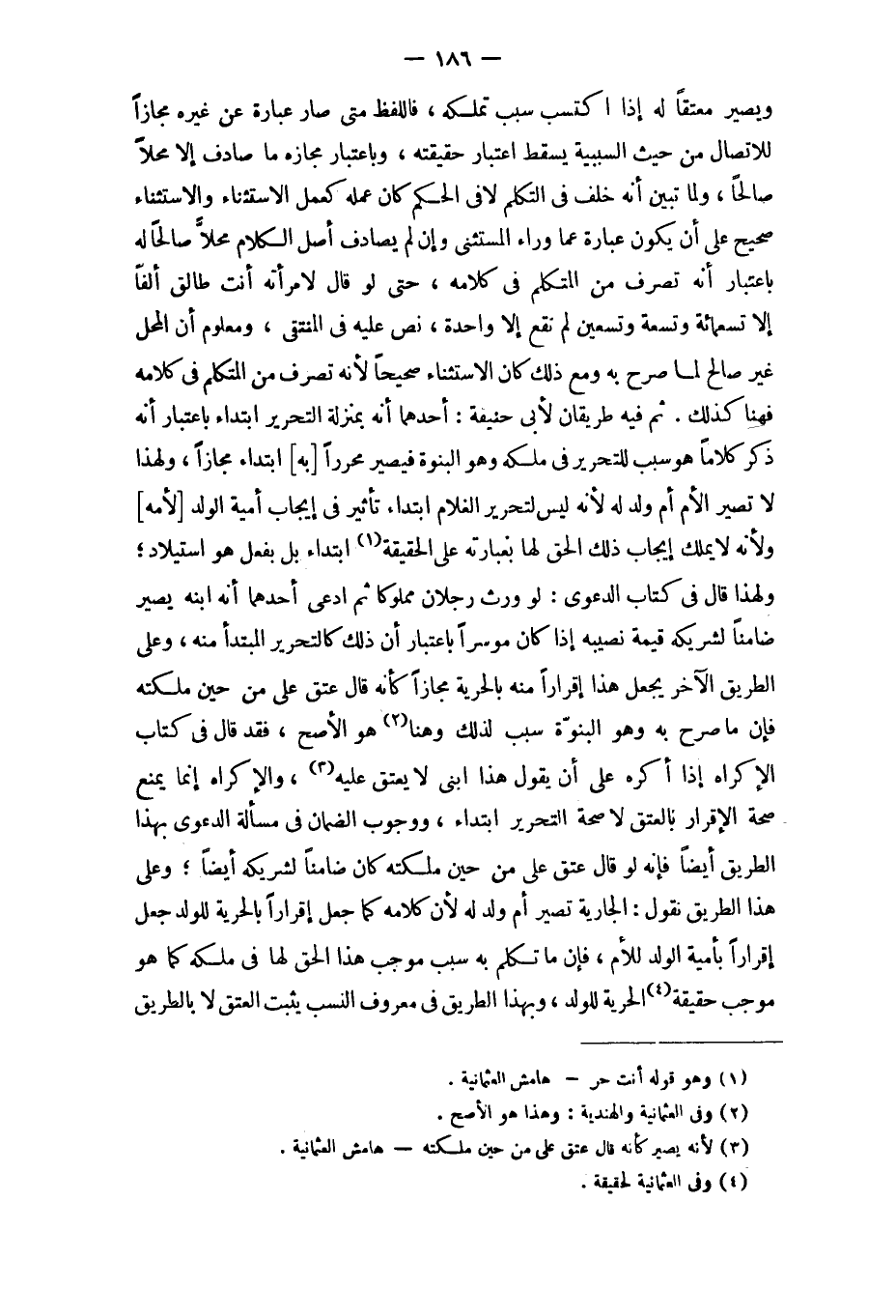 وَيصير معتقا لَهُ إِذا اكْتسب سَبَب تملكه فاللفظ مَتى صَار عبارَة عَن غَيره مجَازًا للاتصال من حَيْثُ السَّبَبِيَّة يسْقط اعْتِبَار حَقِيقَته وَبِاعْتِبَار مجازه مَا صَادف إِلَّا محلا صَالحا وَلما تبين أَنه خلف فِي التَّكَلُّم لَا فِي الحكم كَانَ عمله كعمل الِاسْتِثْنَاء وَالِاسْتِثْنَاء صَحِيح على أَن يكون عبارَة عَمَّا وَرَاء الْمُسْتَثْنى وَإِن لم يُصَادف أصل الْكَلَام محلا صَالحا لَهُ بِاعْتِبَار أَنه تصرف من الْمُتَكَلّم فِي كَلَامه حَتَّى لَو قَالَ لامْرَأَته أَنْت طَالِق ألفا إِلَّا تِسْعمائَة وَتِسْعَة وَتِسْعين لم تقع إِلَّا وَاحِدَة نَص عَلَيْهِ فِي الْمُنْتَقى وَمَعْلُوم أَن الْمحل غير صَالح لما صرح بِهِ وَمَعَ ذَلِك كَانَ الِاسْتِثْنَاء صَحِيحا لِأَنَّهُ تصرف من الْمُتَكَلّم فِي كَلَامه فَهُنَا كَذَلِك