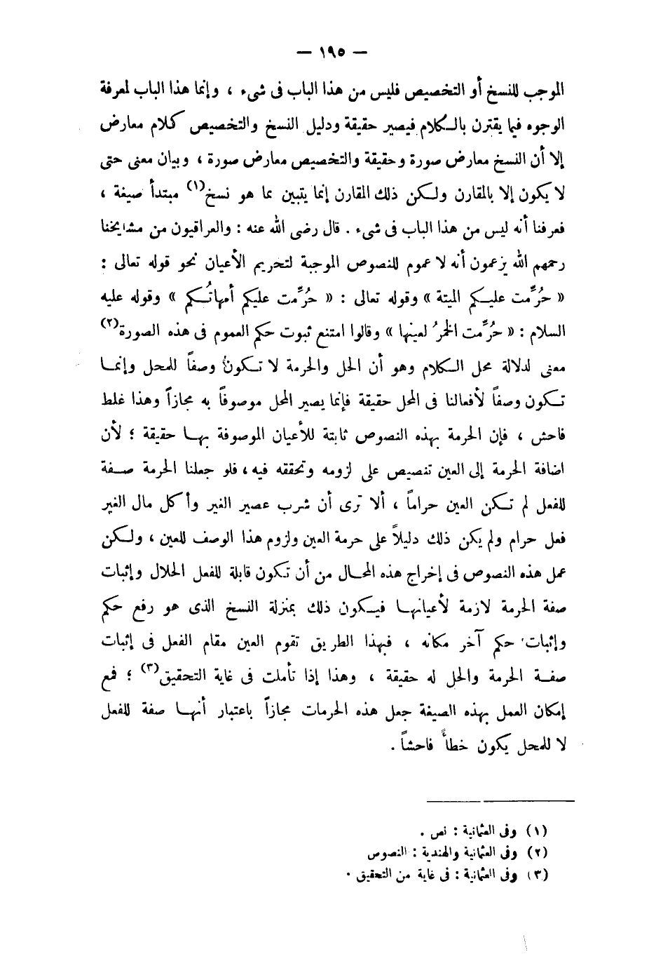 قَالَ رَضِي الله عَنهُ والعراقيون من مَشَايِخنَا رَحِمهم الله يَزْعمُونَ أَنه لَا عُمُوم للنصوص الْمُوجبَة لتَحْرِيم الْأَعْيَان نَحْو قَوْله تَعَالَى {حرمت عَلَيْكُم الْميتَة} وَقَوله تَعَالَى {حرمت عَلَيْكُم أُمَّهَاتكُم} وَقَوله عَلَيْهِ السَّلَام حرمت الْخمر لعينها وَقَالُوا امْتنع ثُبُوت حكم الْعُمُوم فِي هَذِه الصُّورَة معنى لدلَالَة مَحل الْكَلَام وَهُوَ أَن الْحل وَالْحُرْمَة لَا تكون وَصفا للمحل وَإِنَّمَا تكون وَصفا لأفعالنا فِي الْمحل حَقِيقَة فَإِنَّمَا يصير الْمحل مَوْصُوفا بِهِ مجَازًا وَهَذَا غلط فَاحش فَإِن الْحُرْمَة بِهَذِهِ النُّصُوص ثَابِتَة للأعيان الموصوفة بهَا حَقِيقَة لِأَن إِضَافَة الْحُرْمَة إِلَى الْعين تنصيص على لُزُومه وتحققه فِيهِ فَلَو جعلنَا الْحُرْمَة صفة للْفِعْل لم تكن الْعين حَرَامًا أَلا ترى أَن شرب عصير الْغَيْر وَأكل مَال الْغَيْر فعل حرَام وَلم يكن ذَلِك دَلِيلا على حُرْمَة الْعين وَلُزُوم هَذَا الْوَصْف للعين وَلَكِن عمل هَذِه النُّصُوص فِي إِخْرَاج هَذِه الْمحَال من أَن تكون قَابِلَة للْفِعْل الْحَلَال وَإِثْبَات صفة الْحُرْمَة لَازِمَة لأعيانها فَيكون ذَلِك بِمَنْزِلَة النّسخ الَّذِي هُوَ رفع حكم وَإِثْبَات حكم آخر مَكَانَهُ فَبِهَذَا الطَّرِيق تقوم الْعين مقَام الْفِعْل فِي إِثْبَات صفة الْحُرْمَة والحل لَهُ حَقِيقَة وَهَذَا إِذا تَأَمَّلت فِي غَايَة التَّحْقِيق فَمَعَ إِمْكَان الْعَمَل بِهَذِهِ الصِّيغَة جعل هَذِه الحرمات مجَازًا بِاعْتِبَار أَنَّهَا صفة للْفِعْل لَا للمحل يكون خطأ فَاحِشا