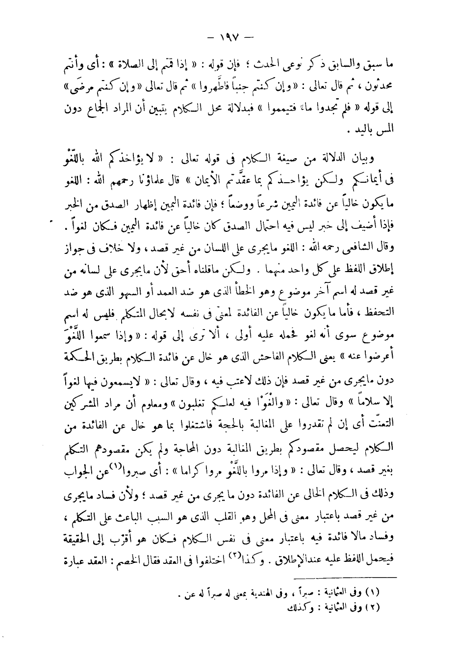 وَلَكِن مَا قُلْنَاهُ أَحَق لِأَن مَا يجْرِي على لِسَانه من غير قصد لَهُ اسْم آخر مَوْضُوع وَهُوَ الْخَطَأ الَّذِي هُوَ ضد الْعمد أَو السَّهْو الَّذِي هُوَ ضد التحفظ فَأَما مَا يكون خَالِيا عَن الْفَائِدَة لِمَعْنى فِي نَفسه لَا بِحَال الْمُتَكَلّم فَلَيْسَ لَهُ اسْم مَوْضُوع سوى أَنه لَغْو فَحَمله عَلَيْهِ أولى أَلا ترى إِلَى قَوْله {وَإِذا سمعُوا اللَّغْو أَعرضُوا عَنهُ} يَعْنِي الْكَلَام الْفَاحِش الَّذِي هُوَ خَال عَن فَائِدَة الْكَلَام بطرِيق الْحِكْمَة دون مَا يجْرِي من غير قصد فَإِن ذَلِك لَا عتب فِيهِ وَقَالَ تَعَالَى {لَا يسمعُونَ فِيهَا لَغوا إِلَّا سَلاما} وَقَالَ تَعَالَى {والغوا فِيهِ لَعَلَّكُمْ تغلبون} وَمَعْلُوم أَن مُرَاد الْمُشْركين التعنت أَي إِن لم تقدروا على المغالبة بِالْحجَّةِ فاشتغلوا بِمَا هُوَ خَال عَن الْفَائِدَة من الْكَلَام ليحصل مقصودكم بطرِيق المغالبة دون المحاجة وَلم يكن مقصودهم التَّكَلُّم بِغَيْر قصد وَقَالَ تَعَالَى {وَإِذا مروا بِاللَّغْوِ مروا كراما} أَي صَبَرُوا عَن الْجَواب وَذَلِكَ فِي الْكَلَام الْخَالِي عَن الْفَائِدَة دون مَا يجْرِي من غير قصد وَلِأَن فَسَاد مَا يجْرِي من غير قصد بِاعْتِبَار معنى فِي الْمحل وَهُوَ الْقلب الَّذِي هُوَ السَّبَب الْبَاعِث على التَّكَلُّم وَفَسَاد مَا لَا فَائِدَة فِيهِ بِاعْتِبَار معنى فِي نفس الْكَلَام فَكَانَ هُوَ أقرب إِلَى الْحَقِيقَة فَيحمل اللَّفْظ عَلَيْهِ عِنْد الْإِطْلَاق