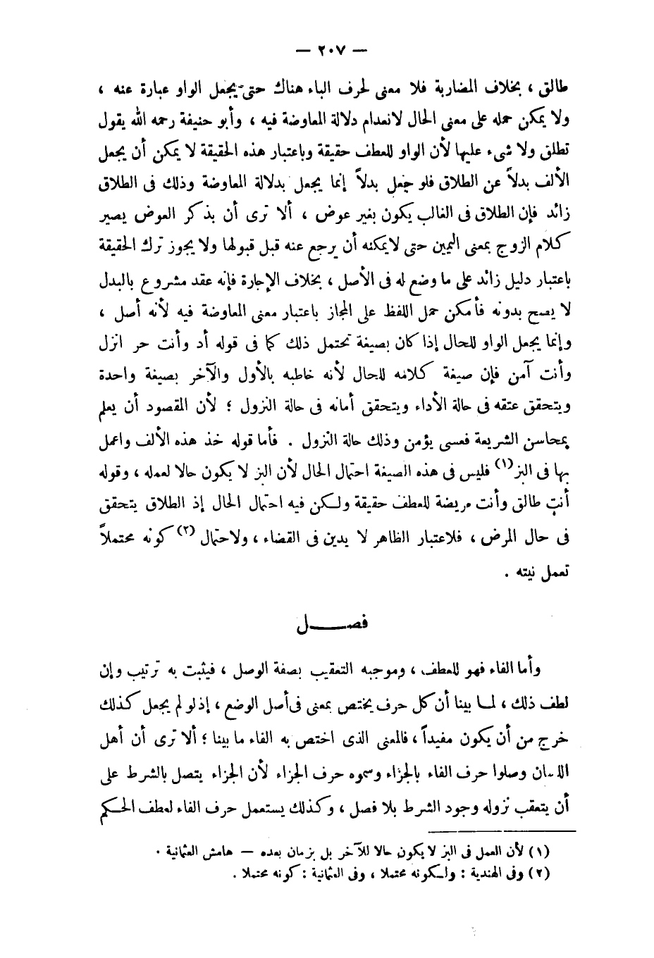 وَأما الْفَاء فَهُوَ للْعَطْف وموجبه التعقيب بِصفة الْوَصْل فَيثبت بِهِ تَرْتِيب وَإِن لطف ذَلِك لما بَينا أَن كل حرف يخْتَص بِمَعْنى فِي أصل الْوَضع إِذْ لَو لم يَجْعَل كَذَلِك خرج من أَن يكون مُفِيدا فَالْمَعْنى الَّذِي اخْتصَّ بِهِ الْفَاء مَا بَينا أَلا ترى أَن أهل اللِّسَان وصلوا حرف الْفَاء بالجزاء وسموه حرف الْجَزَاء لِأَن الْجَزَاء يتَّصل بِالشّرطِ على أَن يتعقب نُزُوله وجود الشَّرْط بِلَا فصل وَكَذَلِكَ يسْتَعْمل حرف الْفَاء لعطف الحكم