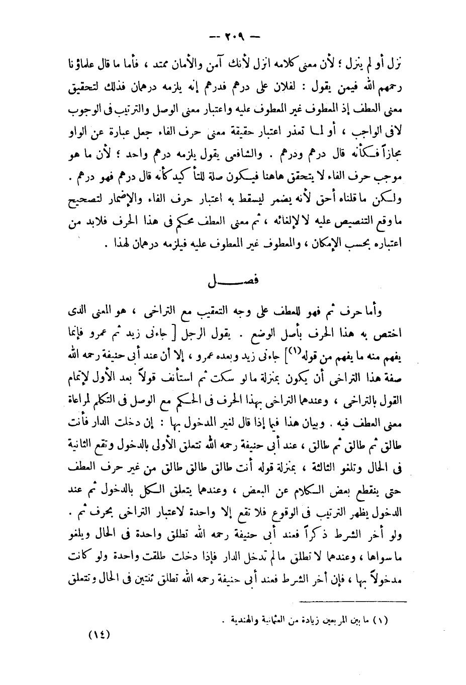 يَقُول الرجل (جَاءَنِي زيد ثمَّ عَمْرو فَإِنَّمَا يفهم مِنْهُ مَا يفهم من قَوْله) جَاءَنِي زيد وَبعده عَمْرو إِلَّا أَن عِنْد أبي حنيفَة رَحمَه الله صفة هَذَا التَّرَاخِي أَن يكون بِمَنْزِلَة مَا لَو سكت ثمَّ اسْتَأْنف قولا بعد الأول لإتمام القَوْل بالتراخي وَعِنْدَهُمَا التَّرَاخِي بِهَذَا الْحَرْف فِي الحكم مَعَ الْوَصْل فِي التَّكَلُّم لمراعاة معنى الْعَطف فِيهِ