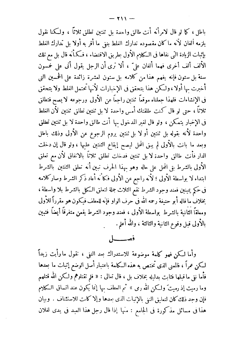 بَاطِل كَمَا لَو قَالَ لامْرَأَته أَنْت طَالِق وَاحِدَة بل اثْنَتَيْنِ تطلق ثَلَاثًا وَلَكنَّا نقُول يلْزمه أَلفَانِ لِأَنَّهُ مَا كَانَ مَقْصُوده تدارك الْغَلَط بِنَفْي مَا أقرّ بِهِ أَولا بل تدارك الْغَلَط بِإِثْبَات الزِّيَادَة الَّتِي نفاها فِي الْكَلَام الأول بطرِيق الِاقْتِضَاء فَكَأَنَّهُ قَالَ بل مَعَ تِلْكَ الْألف ألف أُخْرَى فهما أَلفَانِ عَليّ أَلا ترى أَن الرجل يَقُول أَتَى عَليّ خَمْسُونَ سنة بل سِتُّونَ فَإِنَّهُ يفهم هَذَا من كَلَامه بل سِتُّونَ لعشرة زَائِدَة على الْخمسين الَّتِي أخْبرت بهَا أَولا وَلَكِن هَذَا يتَحَقَّق فِي الإخبارات لِأَنَّهَا تحْتَمل الْغَلَط وَلَا يتَحَقَّق فِي الإنشاءات فَلهَذَا جَعَلْنَاهُ موقعا اثْنَتَيْنِ رَاجعا عَن الأولى ورجوعه لَا يَصح فَتطلق ثَلَاثًا حَتَّى لَو قَالَ كنت طَلقتك أمس وَاحِدَة لَا بل اثْنَتَيْنِ تطلق اثْنَتَيْنِ لِأَن الْغَلَط فِي الْإِخْبَار يتَمَكَّن وَلَو قَالَ لغير الْمَدْخُول بهَا أَنْت طَالِق وَاحِدَة لَا بل اثْنَتَيْنِ تطلق وَاحِدَة لِأَنَّهُ بقوله بل اثْنَتَيْنِ أَولا بل اثْنَتَيْنِ يروم الرُّجُوع عَن الأولى وَذَلِكَ بَاطِل وَبَعْدَمَا بَانَتْ بِالْأولَى لم يبْق الْمحل ليَصِح إِيقَاع الثِّنْتَيْنِ عَلَيْهَا وَلَو قَالَ إِن دخلت الدَّار فَأَنت طَالِق وَاحِدَة لَا بل اثْنَتَيْنِ فَدخلت تطلق ثَلَاثًا بالِاتِّفَاقِ لِأَن مَعَ تعلق الأولى بِالشّرطِ بَقِي الْمحل على حَاله وَهُوَ بِهَذَا الْحَرْف تبين أَنه تعلق الثِّنْتَيْنِ بِالشّرطِ ابْتِدَاء لَا بِوَاسِطَة الأولى لِأَنَّهُ رَاجع عَن الأولى فَكَأَنَّهُ أعَاد ذكر الشَّرْط وَصَارَ كَلَامه فِي حكم يمينين فَعِنْدَ وجود الشَّرْط تقع الثَّلَاث جملَة لتَعلق الْكل بِالشّرطِ بِلَا وَاسِطَة بِخِلَاف مَا قَالَه أَبُو حنيفَة رَحمَه الله فِي حرف الْوَاو فَإِنَّهُ للْعَطْف فَيكون هُوَ مقررا للأولى ومعلقا الثَّانِيَة بِالشّرطِ بِوَاسِطَة الأولى فَعِنْدَ وجود الشَّرْط يقعن مُتَفَرقًا أَيْضا فَتبين بِالْأولَى قبل وُقُوع الثَّانِيَة وَالثَّالِثَة وَالله أعلم