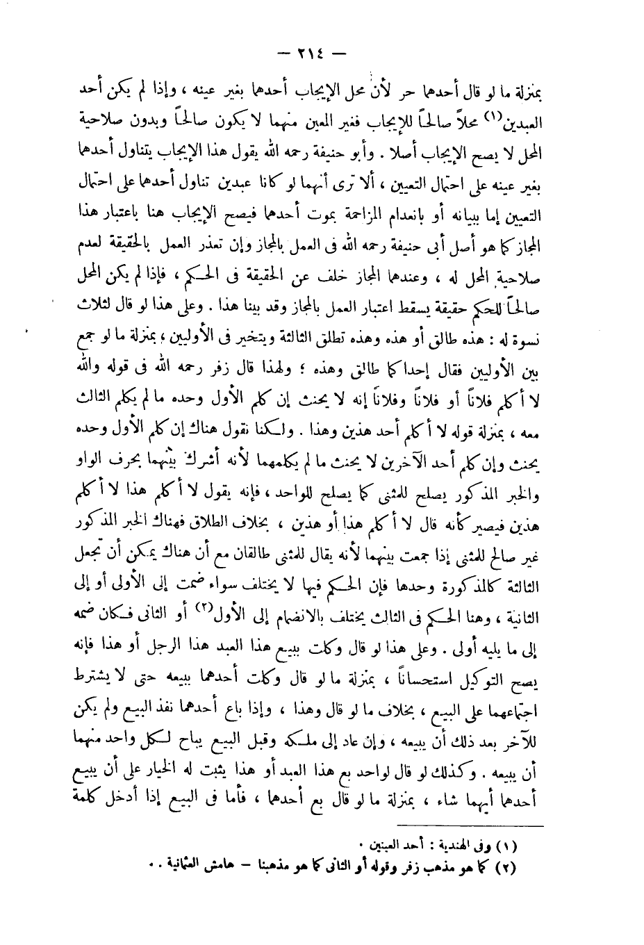 وَأَبُو حنيفَة رَحمَه الله يَقُول هَذَا الْإِيجَاب يتَنَاوَل أَحدهمَا بِغَيْر عينه على احْتِمَال التَّعْيِين أَلا ترى أَنَّهُمَا لَو كَانَا عَبْدَيْنِ تنَاول أَحدهمَا على احْتِمَال التَّعْيِين إِمَّا ببيانه أَو بانعدام الْمُزَاحمَة بِمَوْت أَحدهمَا فَيصح الْإِيجَاب هُنَا بِاعْتِبَار هَذَا الْمجَاز كَمَا هُوَ أصل أبي حنيفَة رَحمَه الله فِي الْعَمَل بالمجاز وَإِن تعذر الْعَمَل بِالْحَقِيقَةِ لعدم صَلَاحِية الْمحل لَهُ وَعِنْدَهُمَا الْمجَاز خلف عَن الْحَقِيقَة فِي الحكم فَإِذا لم يكن الْمحل صَالحا للْحكم حَقِيقَة يسْقط اعْتِبَار الْعَمَل بالمجاز وَقد بَينا هَذَا