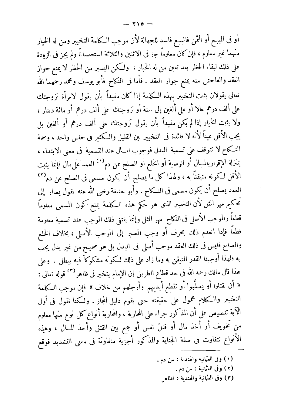 فَأَما فِي النِّكَاح ف أَبُو يُوسُف وَمُحَمّد رحمهمَا الله تَعَالَى يَقُولَانِ يثبت التَّخْيِير بِهَذِهِ الْكَلِمَة إِذا كَانَ مُفِيدا بِأَن يَقُول لامْرَأَة تَزَوَّجتك على ألف دِرْهَم حَالا أَو على أَلفَيْنِ إِلَى سنة أَو تَزَوَّجتك على ألف دِرْهَم أَو مائَة دِينَار وَلَا يثبت الْخِيَار إِذا لم يكن مُفِيدا بِأَن يَقُول تَزَوَّجتك على ألف دِرْهَم أَو أَلفَيْنِ بل يجب الْأَقَل عينا لِأَنَّهُ لَا فَائِدَة فِي التَّخْيِير بَين الْقَلِيل وَالْكثير فِي جنس وَاحِد وَصِحَّة النِّكَاح لَا تتَوَقَّف على تَسْمِيَة الْبَدَل فوجوب المَال عِنْد التَّسْمِيَة فِي معنى الِابْتِدَاء بِمَنْزِلَة الْإِقْرَار بِالْمَالِ أَو الْوَصِيَّة أَو الْخلْع أَو الصُّلْح عَن دم الْعمد على مَال فَإِنَّمَا يثبت الْأَقَل لكَونه متيقنا بِهِ وَلِهَذَا كل مَا يصلح أَن يكون مُسَمّى فِي الصُّلْح عَن دم الْعمد يصلح أَن يكون مُسَمّى فِي النِّكَاح