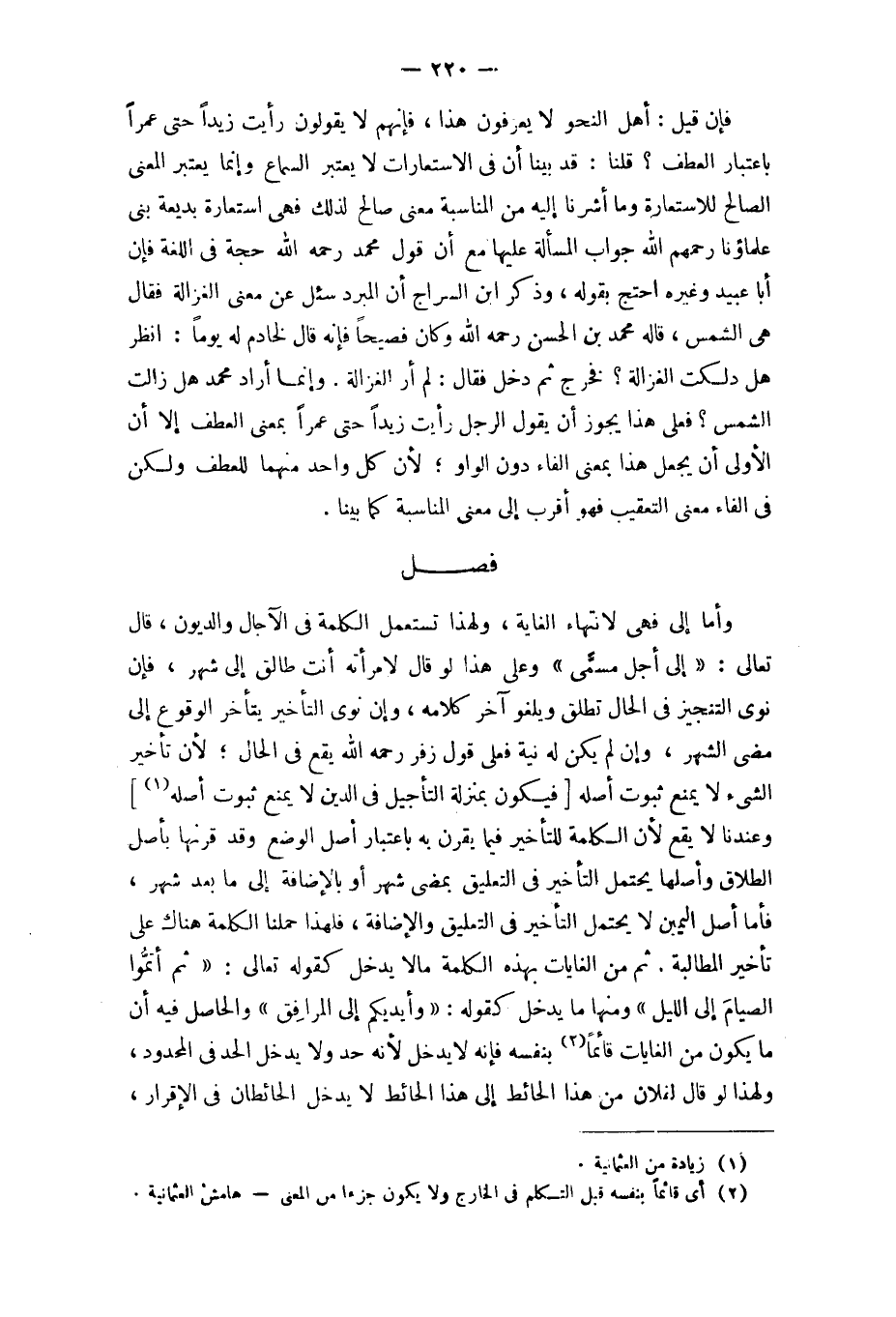 وَإِنَّمَا أَرَادَ مُحَمَّد هَل زَالَت الشَّمْس فعلى هَذَا يجوز أَن يَقُول الرجل رَأَيْت زيدا حَتَّى عمرا بِمَعْنى الْعَطف إِلَّا أَن الأولى أَن يَجْعَل هَذَا بِمَعْنى الْفَاء دون الْوَاو لِأَن كل وَاحِد مِنْهُمَا للْعَطْف وَلَكِن فِي الْفَاء معنى التعقيب فَهُوَ أقرب إِلَى معنى الْمُنَاسبَة كَمَا بَينا