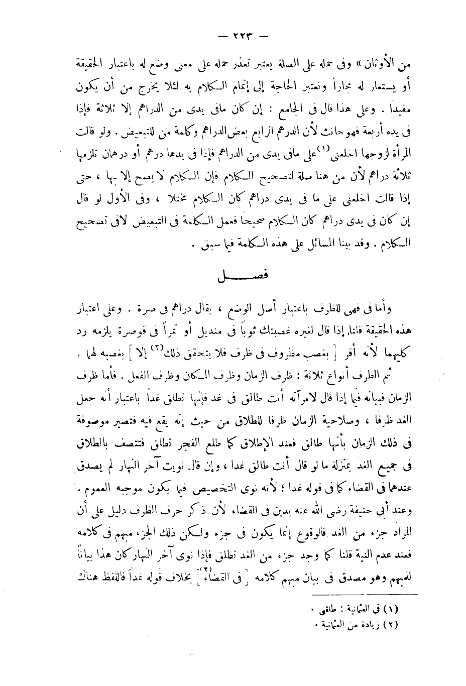 فَأَما ظرف الزَّمَان فبيانه فِيمَا إِذا قَالَ لامْرَأَته أَنْت طَالِق فِي غَد فَإِنَّهَا تطلق غَدا بِاعْتِبَار أَنه جعل الْغَد ظرفا وصلاحية الزَّمَان ظرفا للطَّلَاق من حَيْثُ إِنَّه يَقع فِيهِ فَتَصِير مَوْصُوفَة فِي ذَلِك الزَّمَان بِأَنَّهَا طَالِق فَعِنْدَ الْإِطْلَاق كَمَا طلع الْفجْر تطلق فتتصف بِالطَّلَاق فِي جَمِيع الْغَد بِمَنْزِلَة مَا لَو قَالَ أَنْت طَالِق غَدا وَإِن قَالَ نَوَيْت آخر النَّهَار لم يصدق عِنْدهمَا فِي الْقَضَاء كَمَا فِي قَوْله غَدا لِأَنَّهُ نوى التَّخْصِيص فِيمَا يكون مُوجبه الْعُمُوم