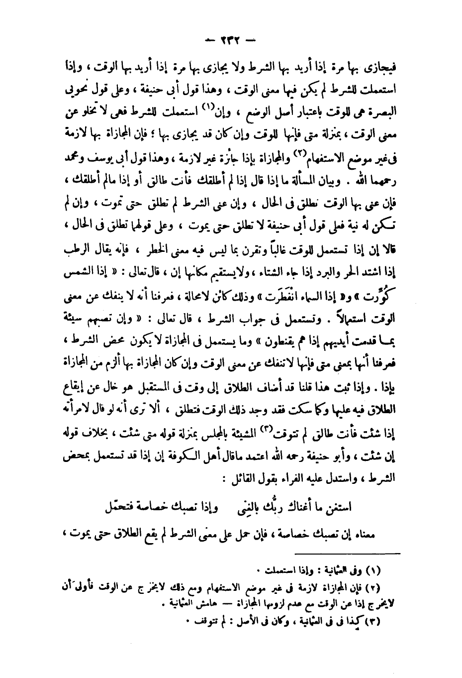 فيجازي بهَا مرّة إِذا أُرِيد بهَا الشَّرْط وَلَا يجازي بهَا مرّة إِذا أُرِيد بهَا الْوَقْت وَإِذا اسْتعْملت للشّرط لم يكن فِيهَا معنى الْوَقْت وَهَذَا قَول أبي حنيفَة وعَلى قَول نَحْويي الْبَصْرَة هِيَ للْوَقْت بِاعْتِبَار أصل الْوَضع وَإِن اسْتعْملت للشّرط فَهِيَ لَا تَخْلُو عَن معنى الْوَقْت بِمَنْزِلَة مَتى فَإِنَّهَا للْوَقْت وَإِن كَانَ قد يجازي بهَا فَإِن المجازاة بهَا لَازِمَة فِي غير مَوضِع الِاسْتِفْهَام والمجازاة بإذا جَائِزَة غير لَازِمَة وَهَذَا قَول أبي يُوسُف وَمُحَمّد رحمهمَا الله