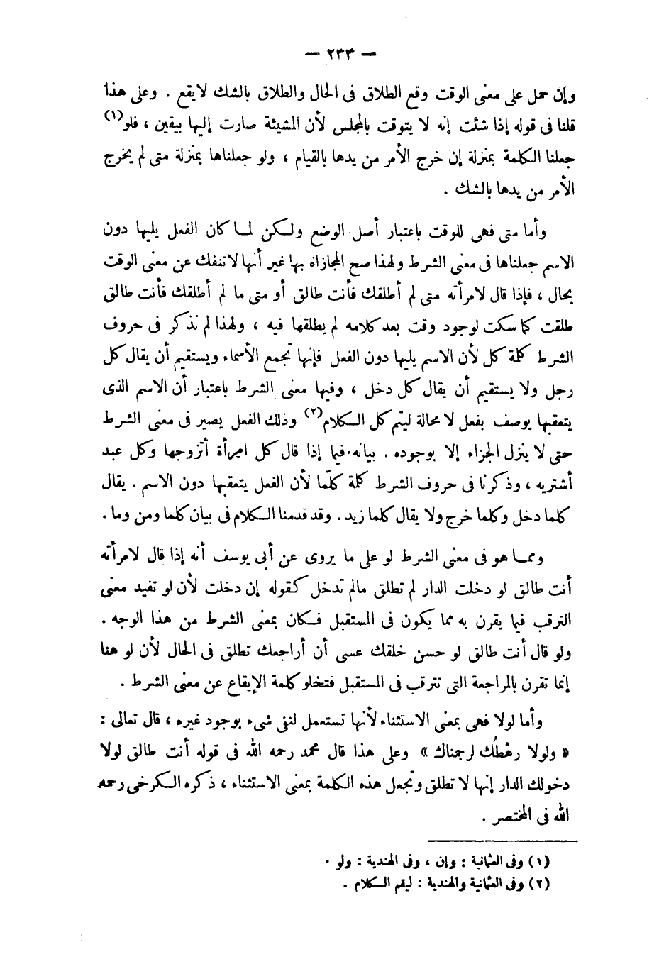 وَأما لَوْلَا فَهِيَ بِمَعْنى الِاسْتِثْنَاء لِأَنَّهَا تسْتَعْمل لنفي شَيْء بِوُجُود غَيره قَالَ تَعَالَى {وَلَوْلَا رهطك لرجمناك} وعَلى هَذَا قَالَ مُحَمَّد رَحمَه الله فِي قَوْله أَنْت طَالِق لَوْلَا دخولك الدَّار إِنَّهَا لَا تطلق وَتجْعَل هَذِه الْكَلِمَة بِمَعْنى الِاسْتِثْنَاء ذكره الْكَرْخِي رَحمَه الله فِي الْمُخْتَصر