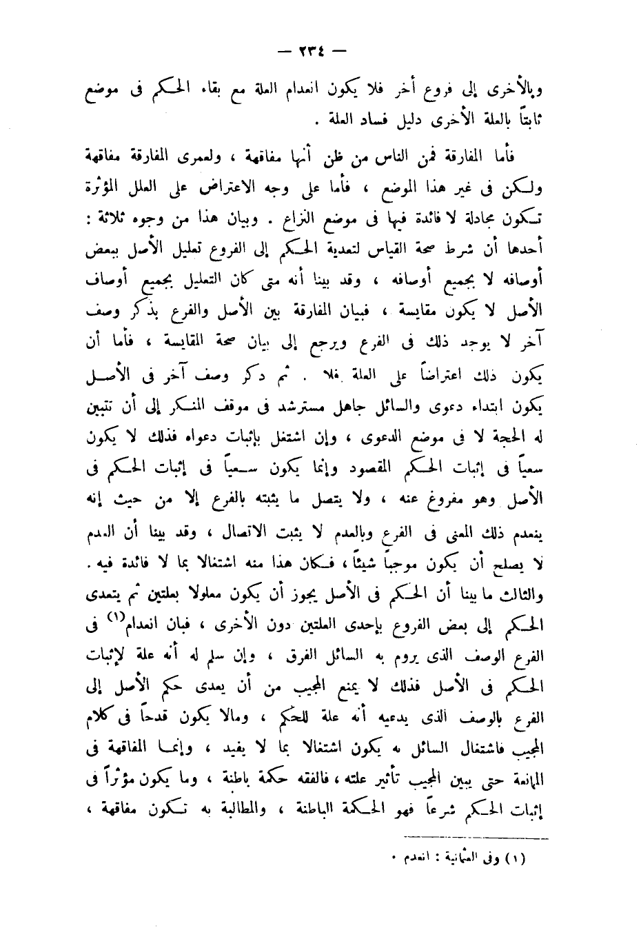 وَالثَّالِث مَا بَينا أَن الحكم فِي الأَصْل يجوز أَن يكون معلولا بعلتين ثمَّ يتَعَدَّى الحكم إِلَى بعض الْفُرُوع بِإِحْدَى العلتين دون الْأُخْرَى فَبَان انعدام فِي الْفَرْع الْوَصْف الَّذِي يروم بِهِ السَّائِل الْفرق وَإِن سلم لَهُ أَنه عِلّة لإِثْبَات الحكم فِي الأَصْل فَذَلِك لَا يمْنَع الْمُجيب من أَن يعدي حكم الأَصْل إِلَى الْفَرْع بِالْوَصْفِ الَّذِي يَدعِيهِ أَنه عِلّة للْحكم وَمَا لَا يكون قدحا فِي كَلَام الْمُجيب فاشتغال السَّائِل بِهِ يكون اشتغالا بِمَا لَا يُفِيد وَإِنَّمَا المفاقهة فِي الممانعة حَتَّى يبين الْمُجيب تَأْثِير علته فالفقه حِكْمَة باطنة وَمَا يكون مؤثرا فِي إِثْبَات الحكم شرعا فَهُوَ الْحِكْمَة الْبَاطِنَة والمطالبة بِهِ تكون مفاقهة