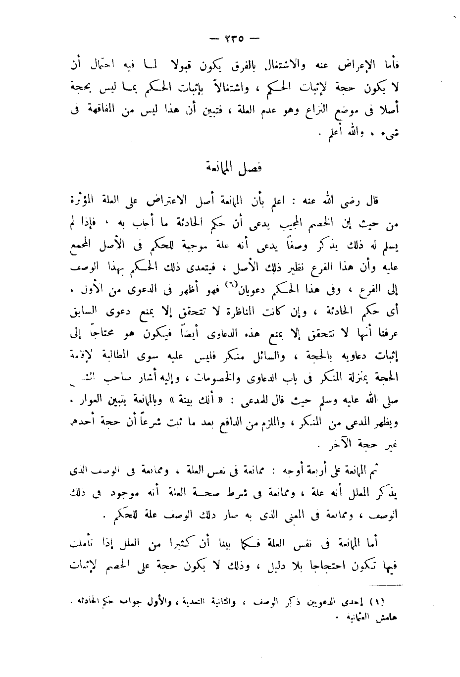 قَالَ رَضِي الله عَنهُ اعْلَم بِأَن الممانعة أصل الِاعْتِرَاض على الْعلَّة المؤثرة من حَيْثُ إِن الْخصم الْمُجيب يَدعِي أَن حكم الْحَادِثَة مَا أجَاب بِهِ فَإِذا لم يسلم لَهُ ذَلِك يذكر وَصفا يَدعِي أَنه عِلّة مُوجبَة للْحكم فِي الأَصْل الْمجمع عَلَيْهِ وَأَن هَذَا الْفَرْع نَظِير ذَلِك الأَصْل فيتعدى ذَلِك الحكم بِهَذَا الْوَصْف إِلَى الْفَرْع وَفِي هَذَا الحكم دعويان فَهُوَ أظهر فِي الدَّعْوَى من الأول أَي حكم الْحَادِثَة وَإِن كَانَت المناظرة لَا تتَحَقَّق إِلَّا بِمَنْع دَعْوَى السَّابِق عرفنَا أَنَّهَا لَا تتَحَقَّق إِلَّا بِمَنْع هَذِه الدَّعَاوَى أَيْضا فَيكون هُوَ مُحْتَاجا إِلَى إِثْبَات دعاويه بِالْحجَّةِ والسائل مُنكر فَلَيْسَ عَلَيْهِ سوى الْمُطَالبَة لإِقَامَة الْحجَّة بِمَنْزِلَة الْمُنكر فِي بَاب الدَّعَاوَى والخصومات وَإِلَيْهِ أَشَارَ صَاحب الشَّرْع صلى الله عَلَيْهِ وَسلم حَيْثُ قَالَ للْمُدَّعِي (أَلَك بَيِّنَة) وبالممانعة يتَبَيَّن الْعَوَارِض وَيظْهر الْمُدَّعِي من الْمُنكر والملزم من الدَّافِع بَعْدَمَا ثَبت شرعا أَن حجَّة أَحدهمَا غير حجَّة الآخر