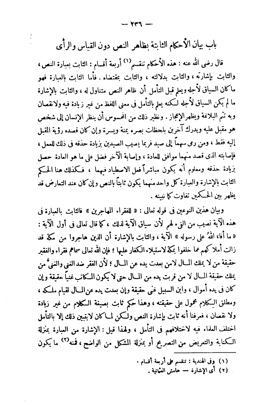 - صَلَّى اللَّهُ عَلَيْهِ وَسَلَّم َ - بَاب بَيَان الْأَحْكَام الثَّابِتَة بِظَاهِر النَّص دون الْقيَاس والرأي - صَلَّى اللَّهُ عَلَيْهِ وَسَلَّم َ - قَالَ رَضِي الله عَنهُ هَذِه الْأَحْكَام تَنْقَسِم أَرْبَعَة أَقسَام الثَّابِت بِعِبَارَة النَّص وَالثَّابِت بإشارته وَالثَّابِت بدلالته وَالثَّابِت بِمُقْتَضَاهُ