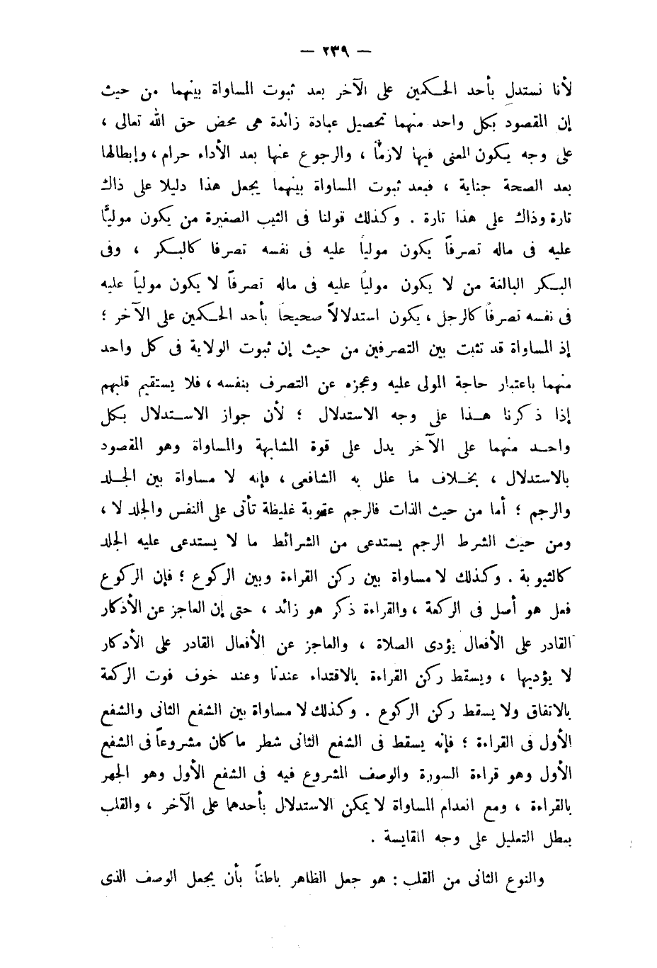 وَكَذَلِكَ لَا مُسَاوَاة بَين الشفع الثَّانِي وَالشَّفْع الأول فِي الْقِرَاءَة فَإِنَّهُ يسْقط فِي الشفع الثَّانِي شطر مَا كَانَ مَشْرُوعا فِي الشفع الأول وَهُوَ قِرَاءَة السُّورَة وَالْوَصْف الْمَشْرُوع فِيهِ فِي الشفع الأول وَهُوَ الْجَهْر بِالْقِرَاءَةِ وَمَعَ انعدام الْمُسَاوَاة لَا يُمكن الِاسْتِدْلَال بِأَحَدِهِمَا على الآخر وَالْقلب يبطل التَّعْلِيل على وَجه المقايسة