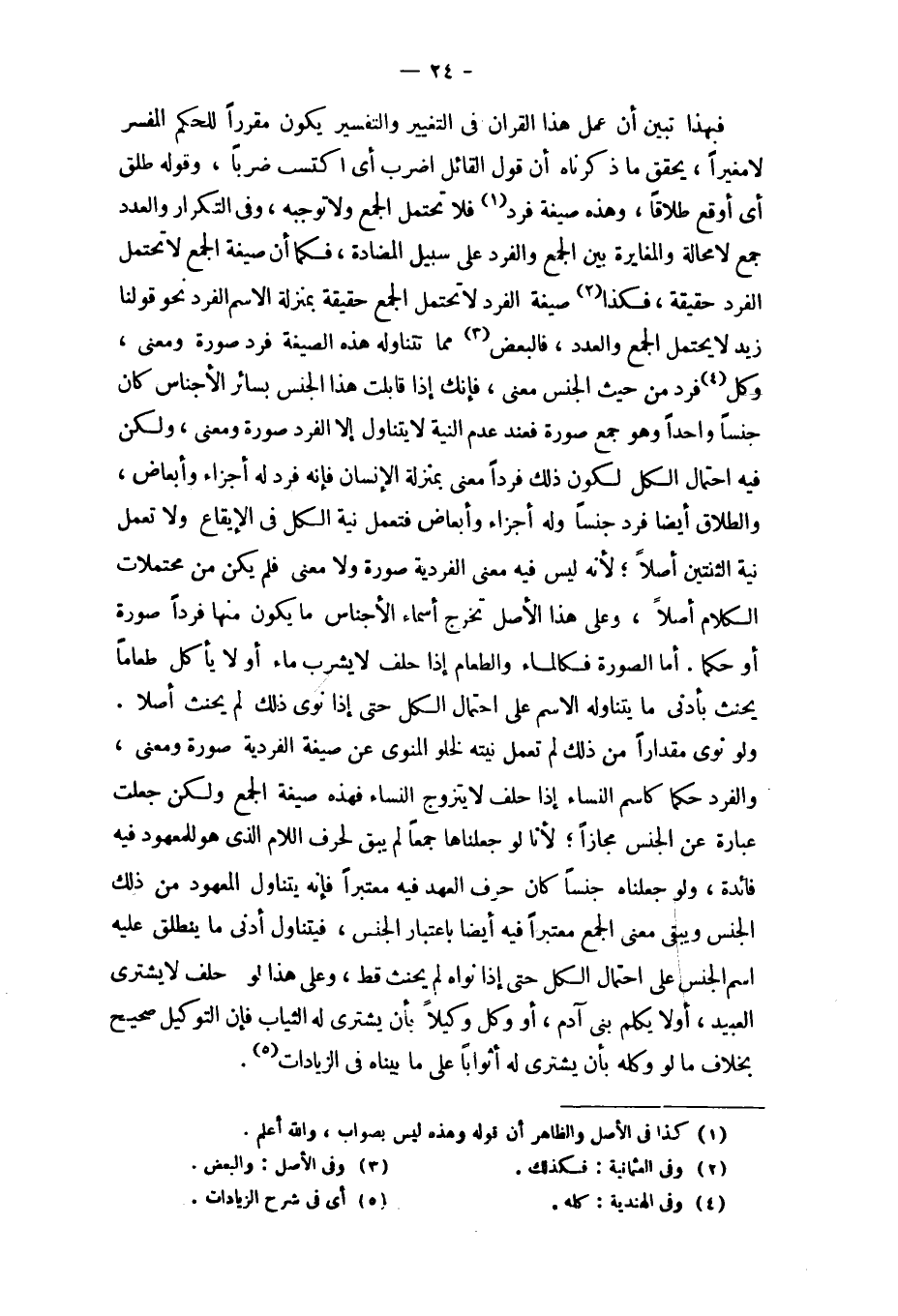 فَبِهَذَا تبين أَن عمل هَذَا الْقرَان فِي التَّغْيِير وَالتَّفْسِير يكون مقررا للْحكم الْمُفَسّر لَا مغيرا يُحَقّق مَا ذَكرْنَاهُ أَن قَول الْقَائِل اضْرِب أَي اكْتسب ضربا وَقَوله طلق أَي أوقع طَلَاقا وَهَذِه صِيغَة فَرد فَلَا تحْتَمل الْجمع وَلَا توجبه وَفِي التّكْرَار وَالْعدَد جمع لَا محَالة والمغايرة بَين الْجمع والفرد على سَبِيل المضادة فَكَمَا أَن صِيغَة الْجمع لَا تحْتَمل الْفَرد حَقِيقَة فَكَذَا صِيغَة الْفَرد لَا تحْتَمل الْجمع حَقِيقَة بِمَنْزِلَة الِاسْم الْفَرد نَحْو قَوْلنَا زيد لَا يحْتَمل الْجمع وَالْعدَد فالبعض مِمَّا تتناوله هَذِه الصِّيغَة فَرد صُورَة وَمعنى وكل فَرد من حَيْثُ الْجِنْس معنى فَإنَّك إِذا قابلت هَذَا الْجِنْس بِسَائِر الْأَجْنَاس كَانَ جِنْسا وَاحِدًا وَهُوَ جمع صُورَة فَعِنْدَ عدم النِّيَّة لَا يتَنَاوَل إِلَّا الْفَرد صُورَة وَمعنى وَلَكِن فِيهِ احْتِمَال الْكل لكَون ذَلِك فَردا معنى بِمَنْزِلَة الْإِنْسَان فَإِنَّهُ فَرد لَهُ أَجزَاء وأبعاض وَالطَّلَاق أَيْضا فَرد جِنْسا وَله أَجزَاء وأبعاض فتعمل نِيَّة الْكل فِي الْإِيقَاع وَلَا تعْمل نِيَّة الثِّنْتَيْنِ أصلا لِأَنَّهُ لَيْسَ فِيهِ معنى الفردية صُورَة وَلَا معنى فَلم يكن من محتملات الْكَلَام أصلا وعَلى هَذَا الأَصْل تخرج أَسمَاء الْأَجْنَاس مَا يكون مِنْهَا فَردا صُورَة أَو حكما